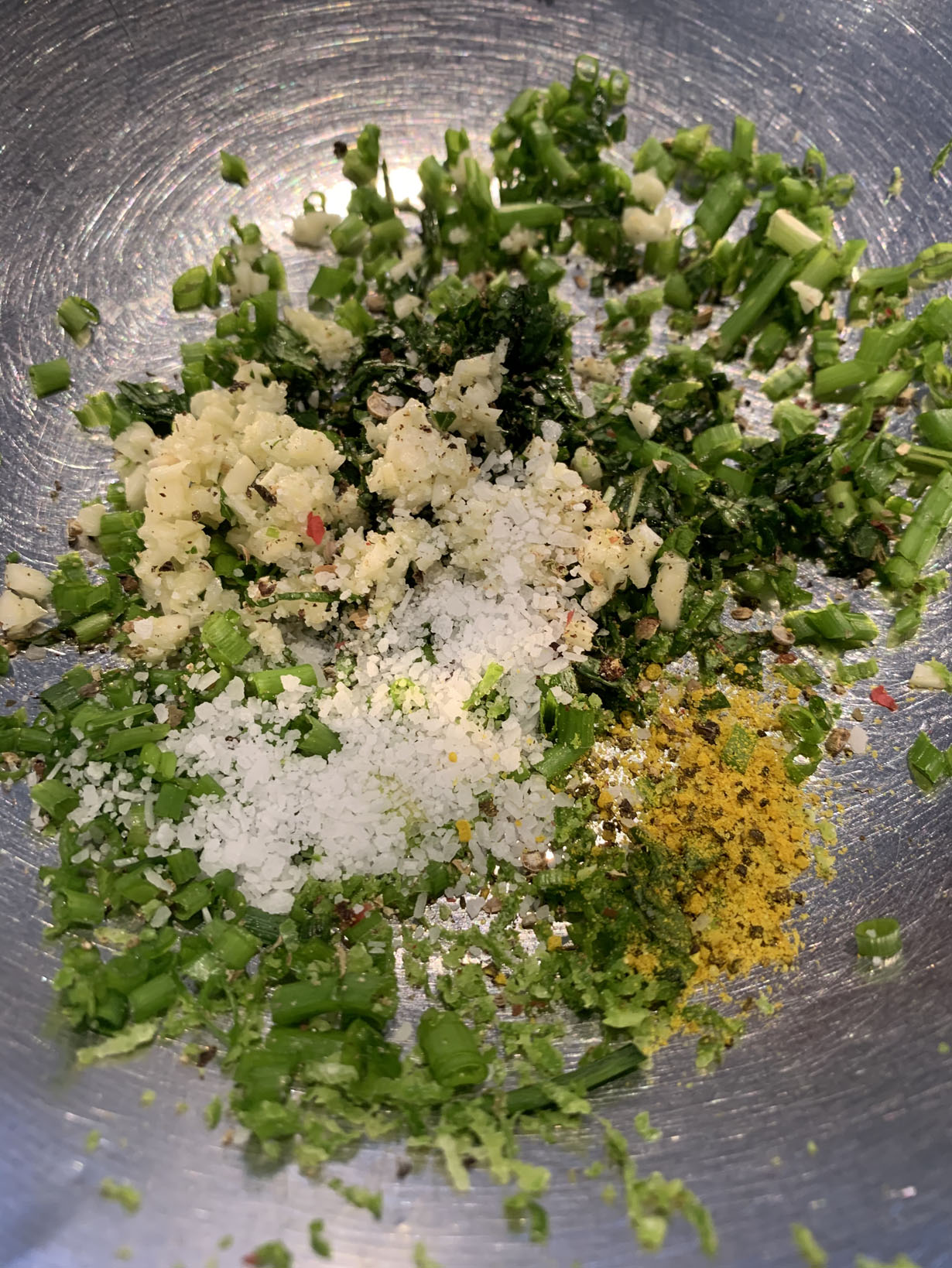 Chop the herbs and garlic and mix together with the salt, lime zest, and peppers. Melt the butter in a pan and add the herb mixture to the melted butter. Cook for 2 minutes (enough to sweat the herbs). Add the lime juice and cook for an additional minute until bubbling. Set aside.