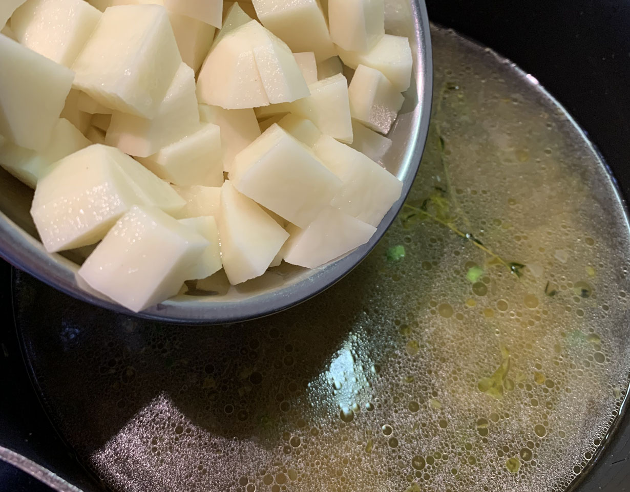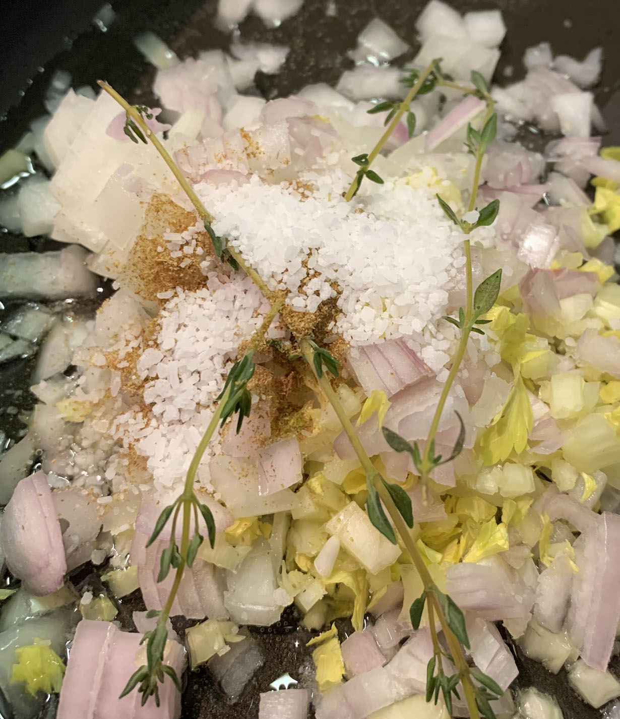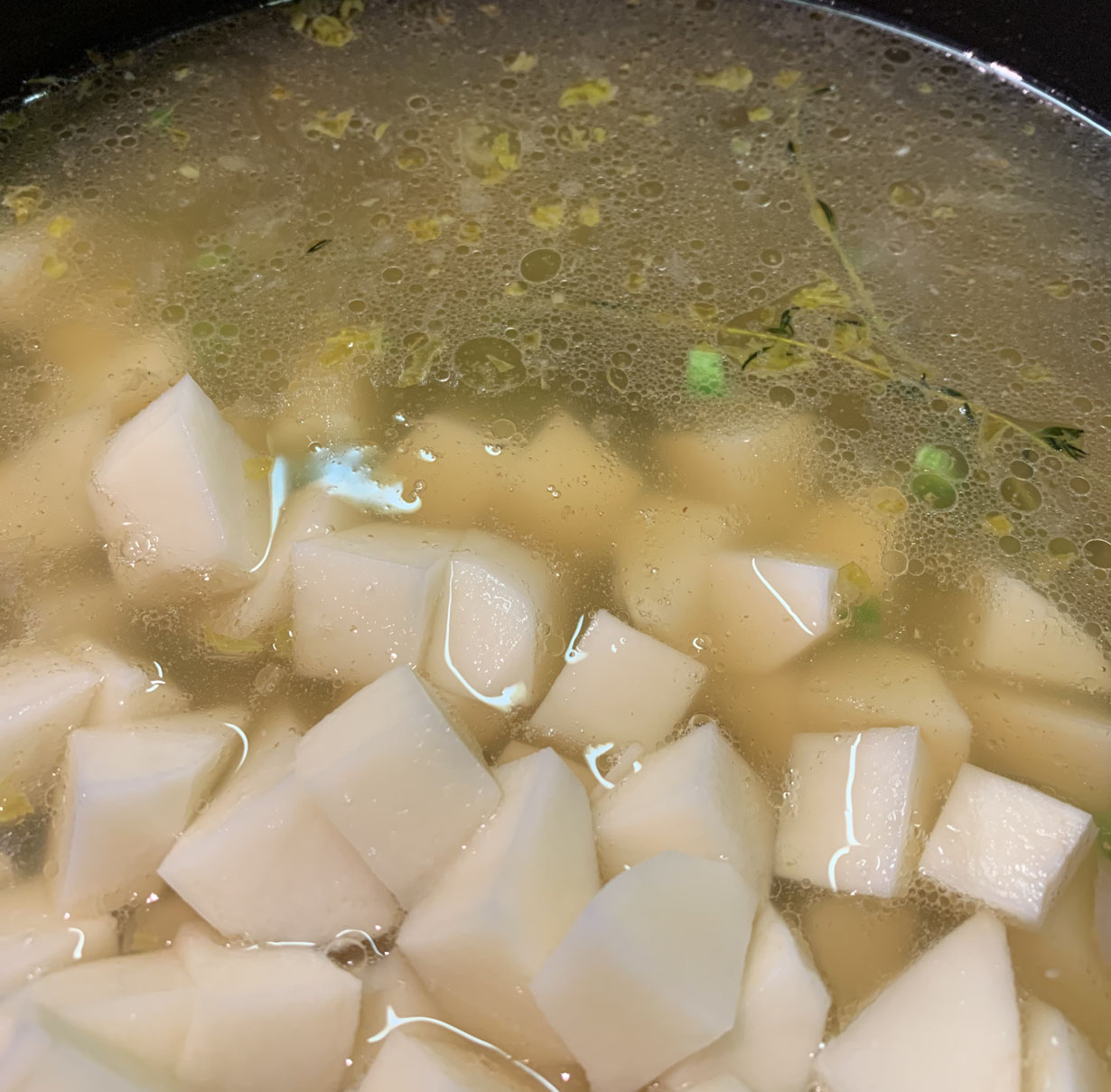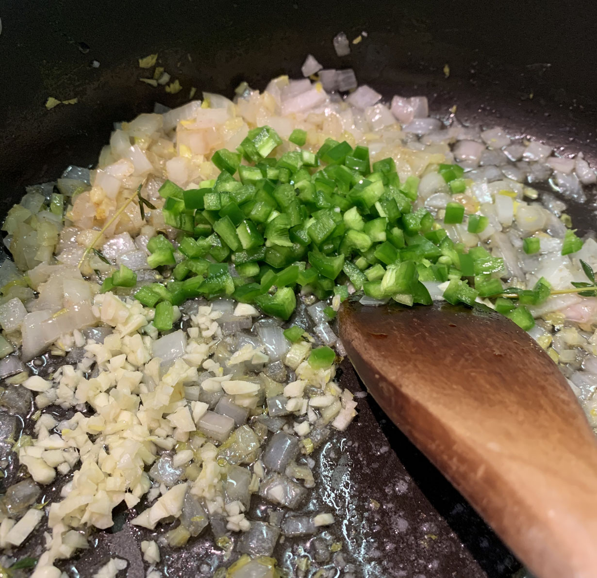 Heat the cooking pot for a few minutes and then add the duck fat. Add the chopped onion, shallot and celery and cook until translucent (approximately 3 minutes). Add the jalapeño pepper and garlic and cook for an additional 2 minutes. Add the stock and the potatoes and cook for 20 to 30 minutes (until the potatoes are tender and a fork can go through them). Once the potatoes are cooked, add the fish, cream and pepper and cook for an additional 10 minutes. Remove the thyme sprigs.
