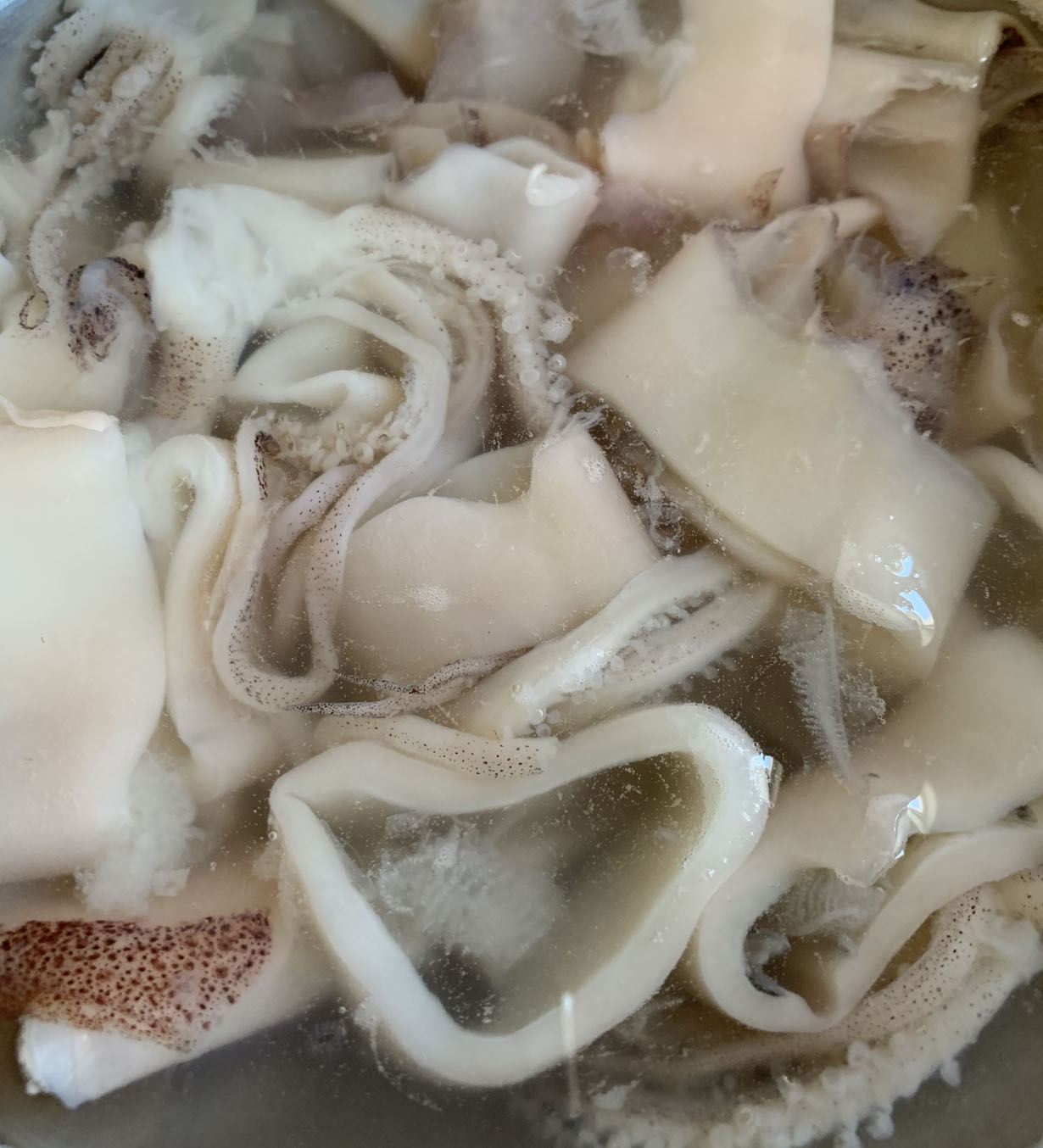 Slice squid into even slices and cut off the end with the tenticles. Soak calamari pieces in a water-soda mixture for 30 minutes. Mix the flour with the salt and set aside. Drain the calamari and immediately toss in the flour mixture to evenly coat the calamari.