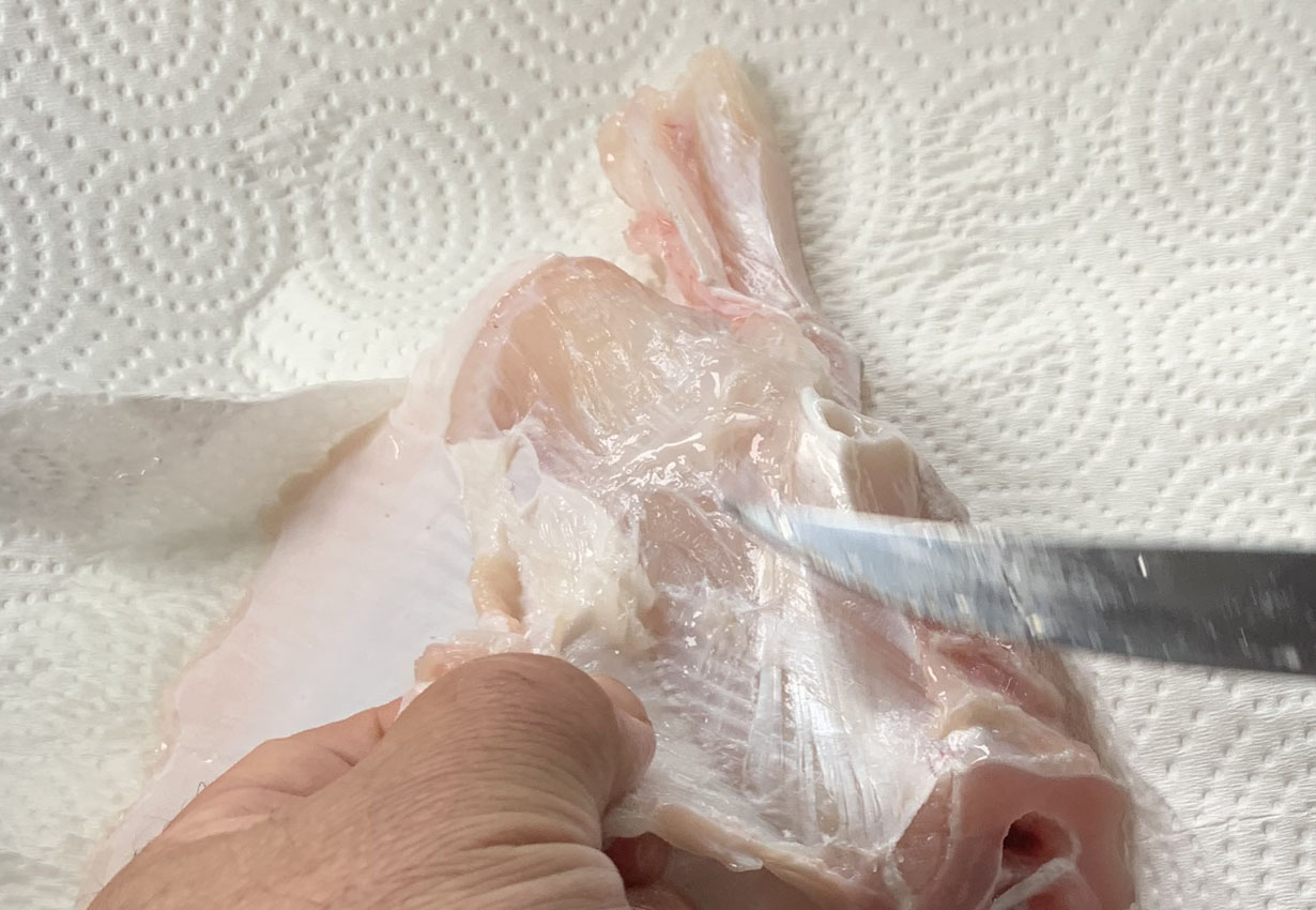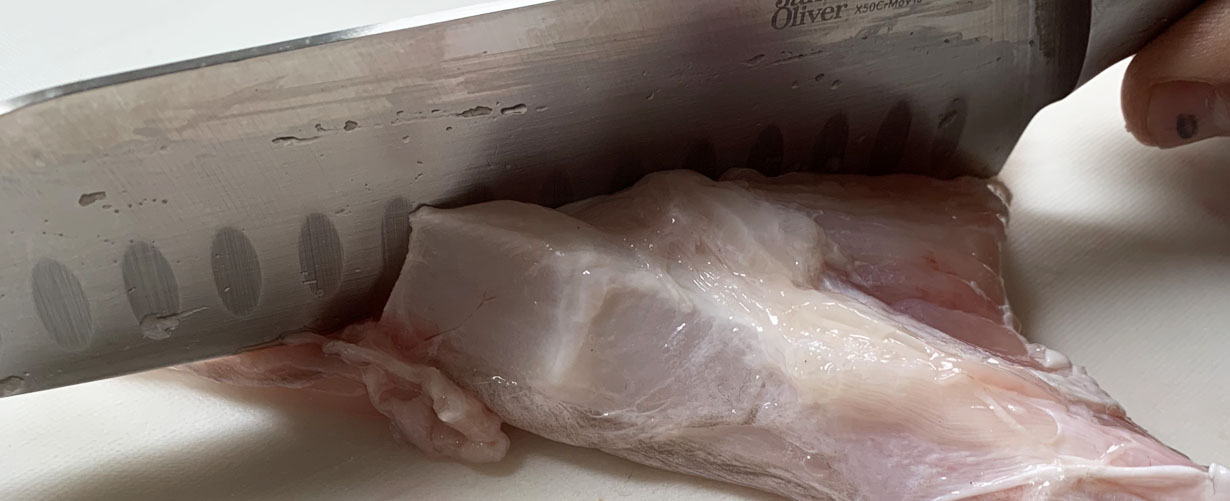 Once the skin has been removed, use a knife to cut the flesh into pieces. At the tip where the cartilage is, use a butcher’s knife or similar to cut into pieces.