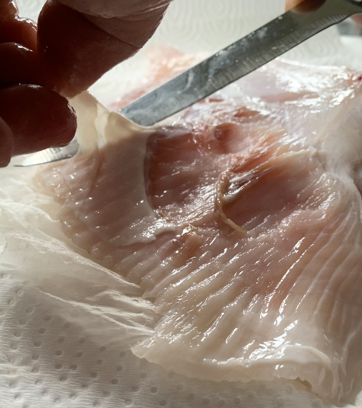 Skate fish has a tough skin on the one side that must be removed. To do so, pull up on one corner and cut into the flesh with a sharp knife. Once you have lifted a part of the skin up, you can run the knife underneath to remove most of the outer skin.