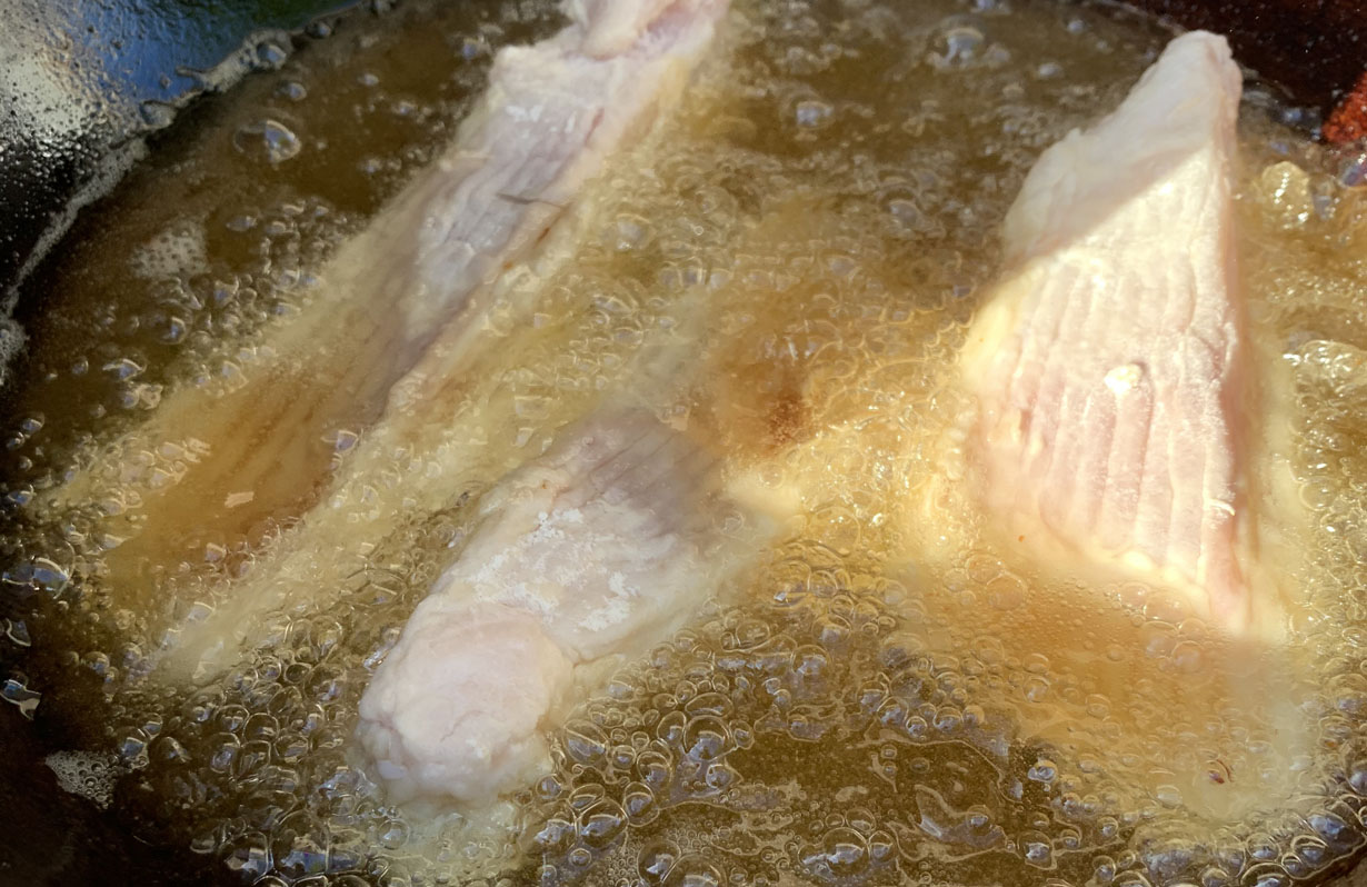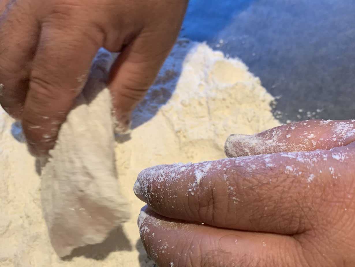 In order to fry the fish, it is best to double dredge the pieces in the seasoned flour. One coating does not stick very well to this fish. Prepare the seasoned flour by mixing the flour with the salt and pepper. Dip the piece into the water bath and then into the flour coating. Once coated, dip it a second time into the water bath followed with a coating of the flour.