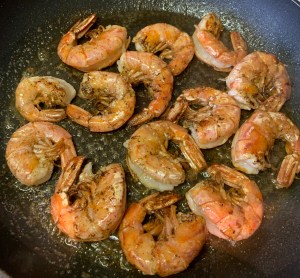 In the same pan, add the tomato sauce and the Kefalotiri and Asiago to heat through until the cheese begins to melt. Add the shrimp to the pan and sprinkle with the feta cheese.