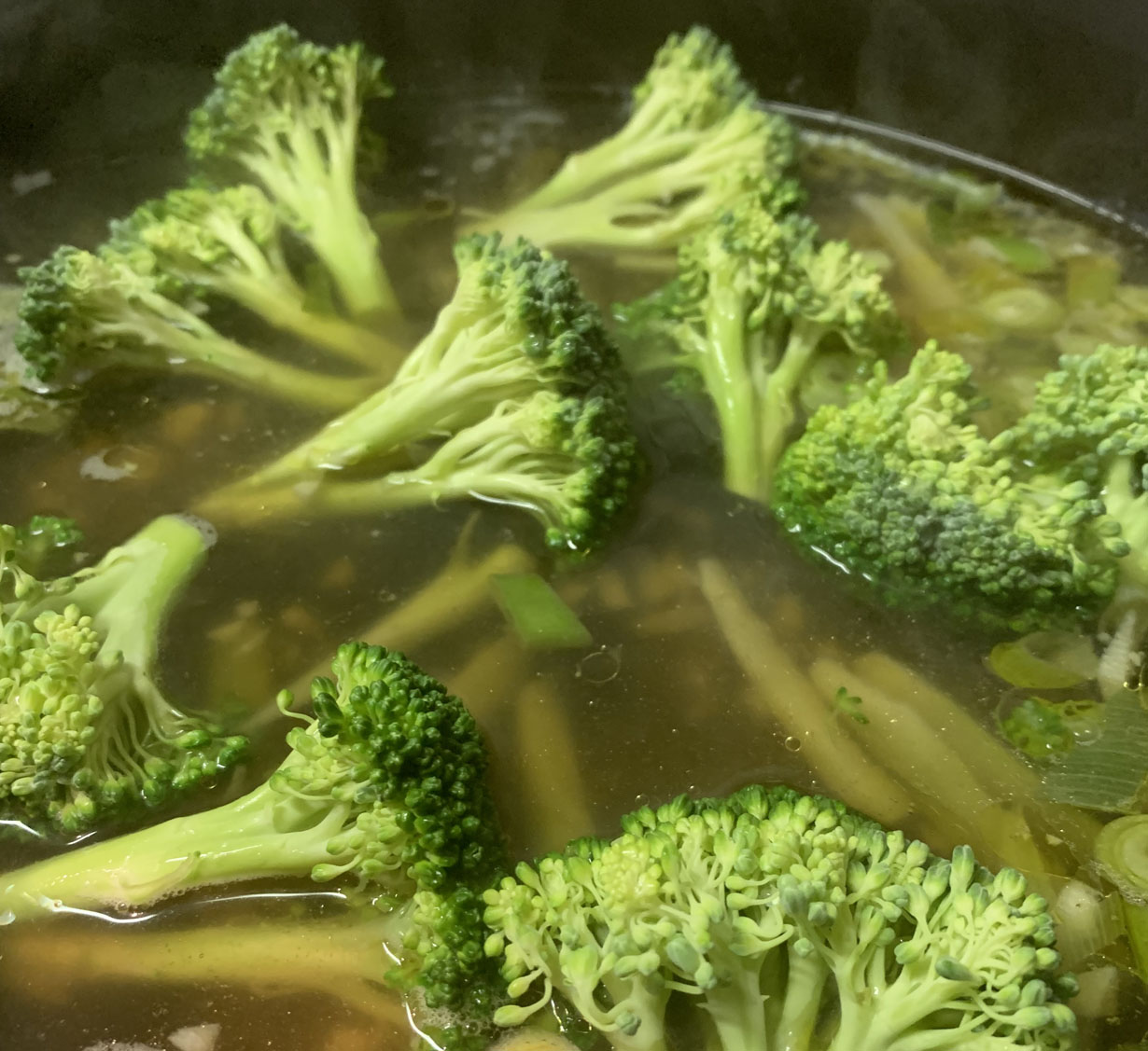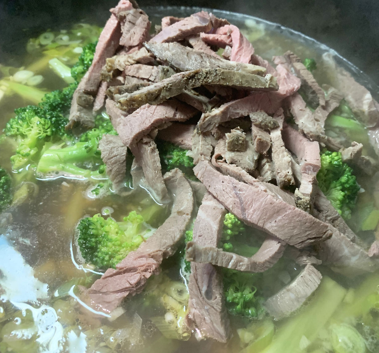 Cut off the broccoli florets into bite size pieces. Remove the outside of the broccoli stems and slice into thin pieces. Set aside. Add 1 tablespoon olive oil into a deep non-stick pan and add the green onion, ginger, broccoli stems, and garlic. Cook for 30 seconds and add the stock. Add the broccoli florets and cook for 3 minutes until broccoli is tender yet still a bit crisp. Add the meat slices and mix together. Add the soy mixture and, while stirring constantly, continue to cook until sauce thickens.