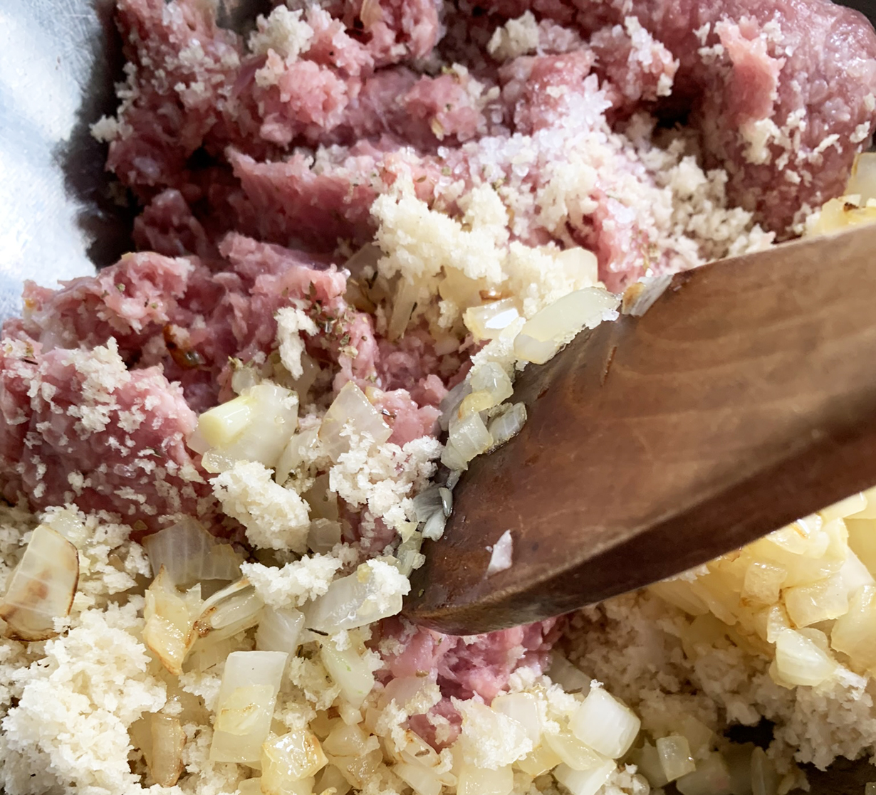 Combine the Panko bread crumbs with the milk. Stir until evenly coated and the milk has been absorbed. Allow to rest. Heat the oil in a frying pan over high heat. Cook the onions in one tablespoon of oil until translucent, approximately 3 minutes. Add the cooked onions and oil, along with the ground beef, egg, and spices to the breadcrumb mixture. Gently mix together until just combined. Do not overmix, otherwise, the meatballs become tough.