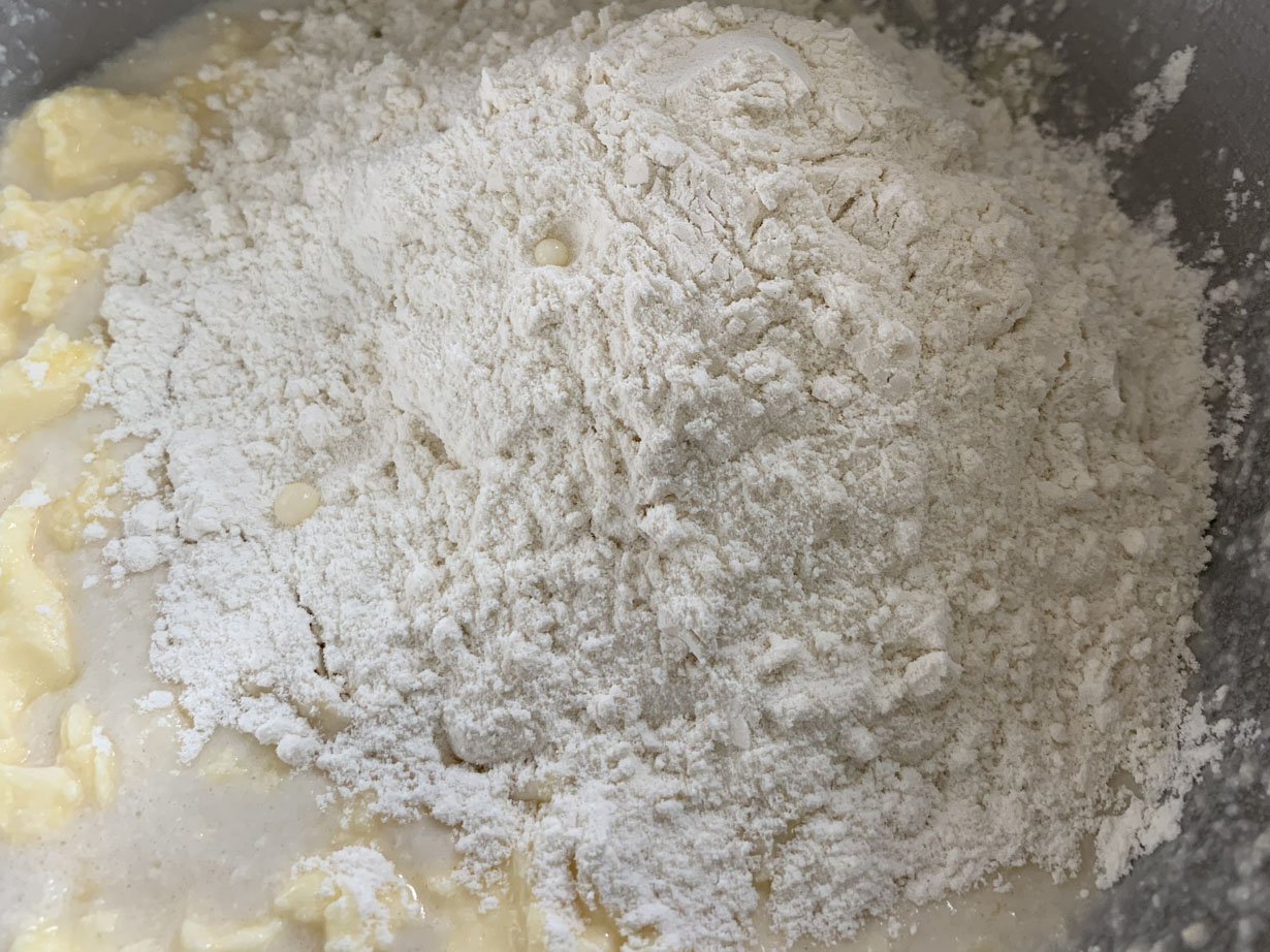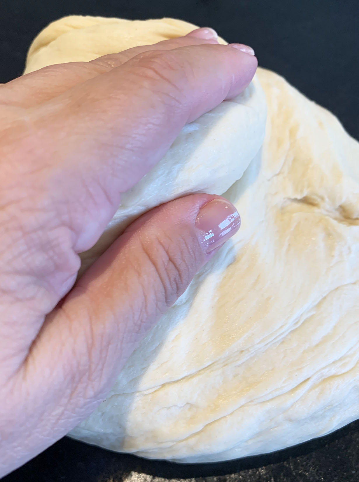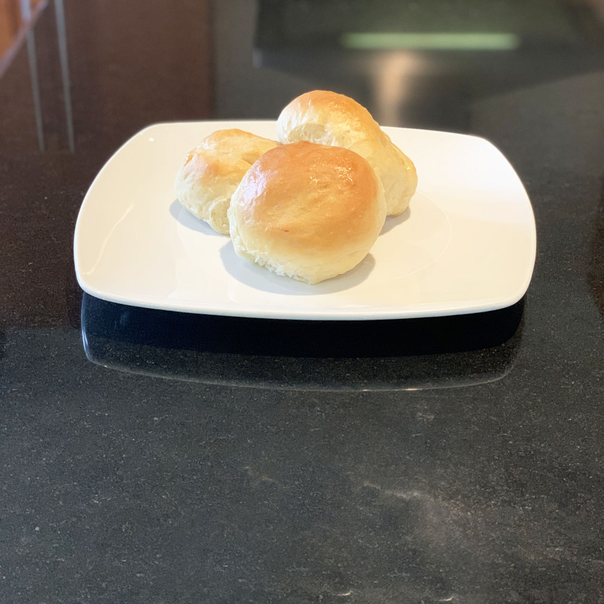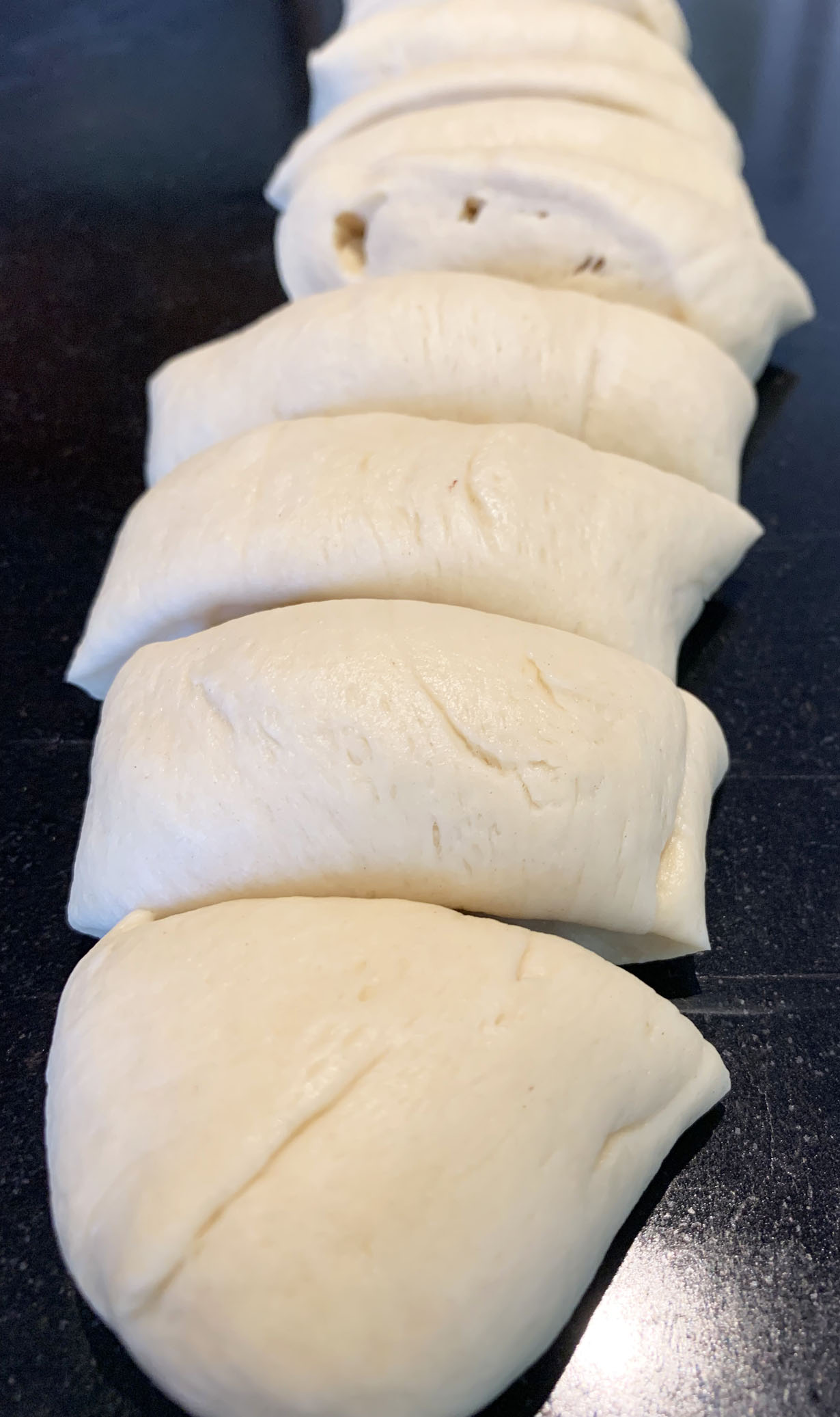 Place the raised dough onto a clean surface and deflate by folding it into itself a couple of times. This dough does not need to be kneaded as the milk creates a very fluffy bread. Roll the bread into a log and cut into 16 equal pieces. Roll each cut piece into a circle and place into a prepared baking sheet lined with parchment paper or a silicone mat. Keep the rolls approximately 2” apart as they will rise and join.