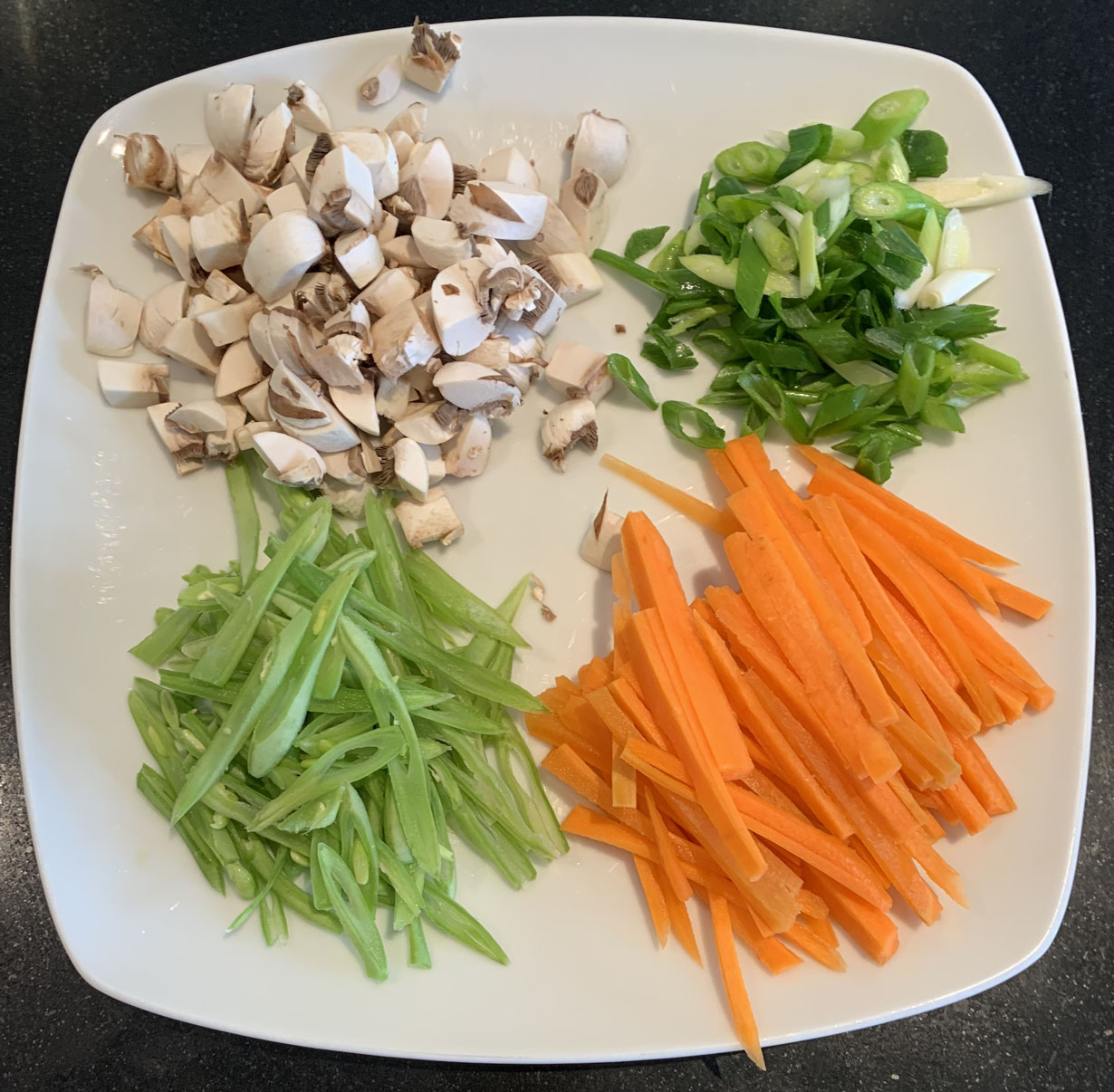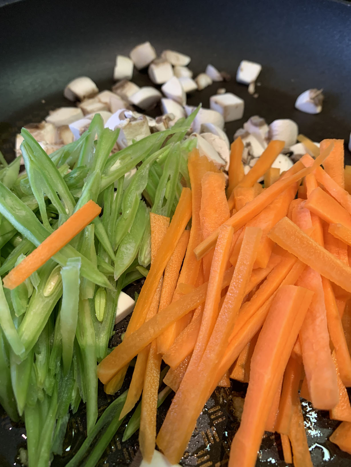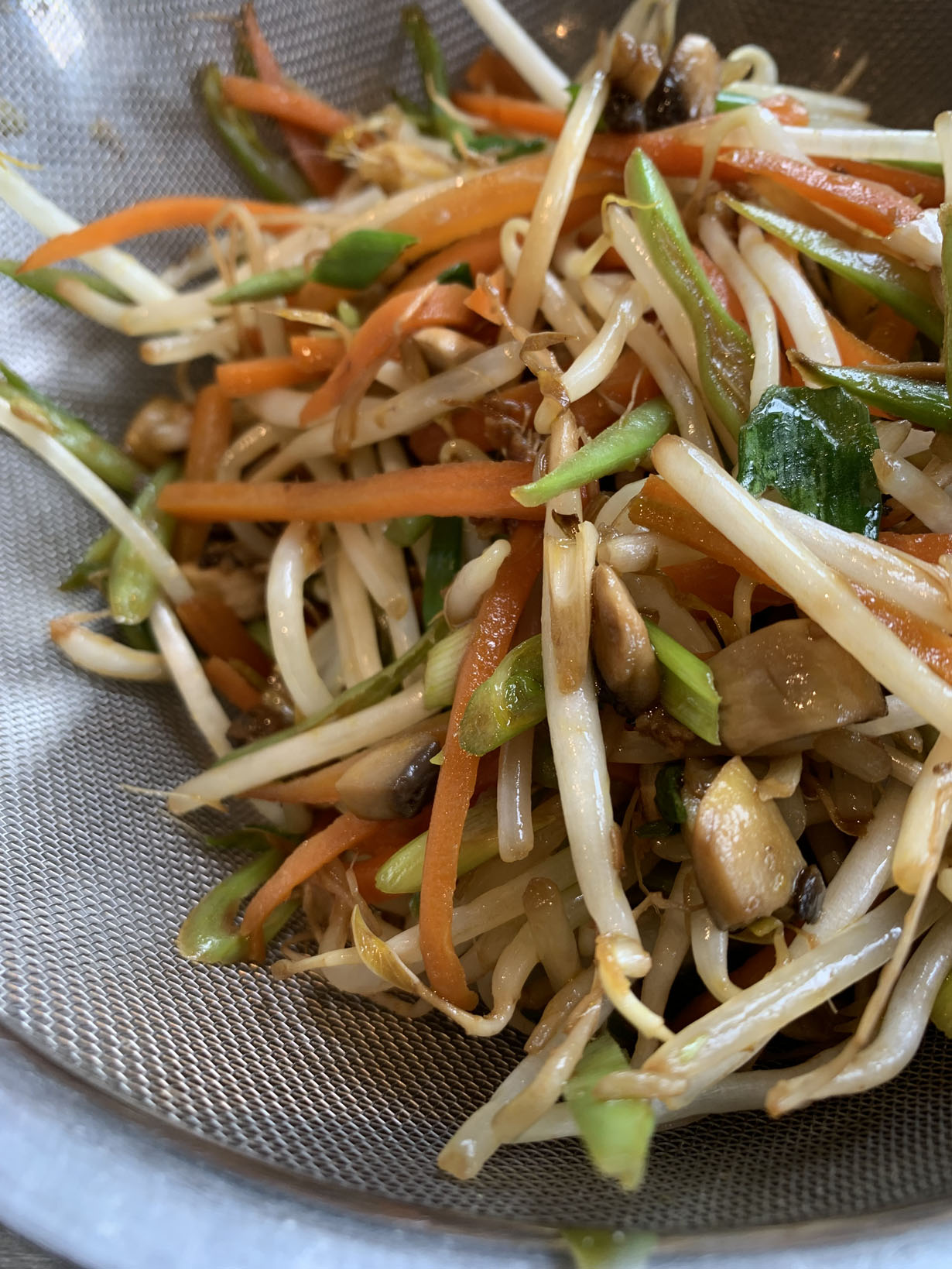 Start by preparing the vegetables (this takes the most time). Cut the carrot and green beans into thin, long strips. Slice the green onions, cut the mushrooms into cubes and shred the ginger. Once all the vegetables are prepared, heat the oil in a pan and add the ginger. Cook for one minute and add the carrots, mushrooms and green beans. Cook for 2 to 3 minutes, or until tender, and then add the scallions. Cook for an additional minute and add the bean sprouts and soy sauce. Season with salt and pepper to taste and transfer to a sieve to allow and juices to drain out. Note: if you are using shrimp or protein, cook in a separate pan and add to the mix in the end.