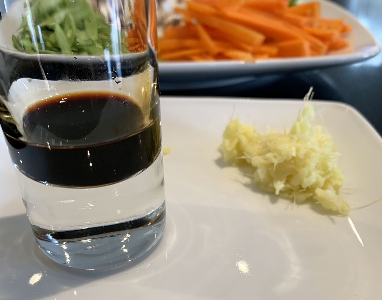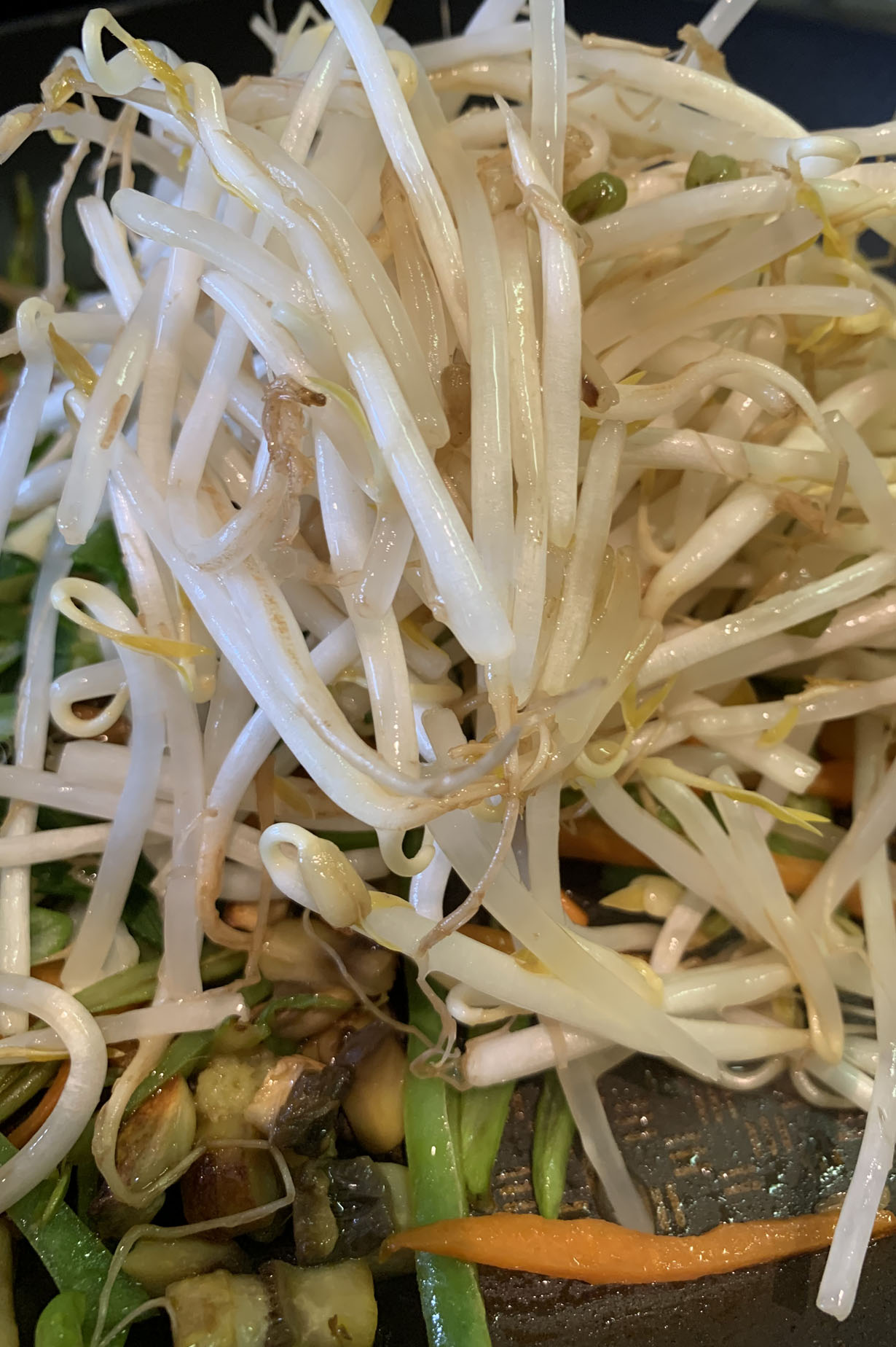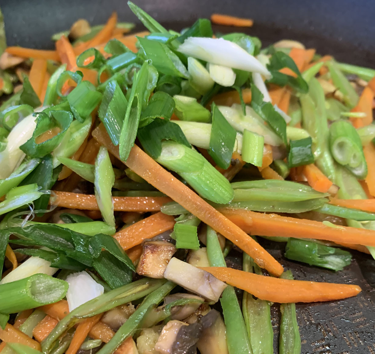 Start by preparing the vegetables (this takes the most time). Cut the carrot and green beans into thin, long strips. Slice the green onions, cut the mushrooms into cubes and shred the ginger. Once all the vegetables are prepared, heat the oil in a pan and add the ginger. Cook for one minute and add the carrots, mushrooms and green beans. Cook for 2 to 3 minutes, or until tender, and then add the scallions. Cook for an additional minute and add the bean sprouts and soy sauce. Season with salt and pepper to taste and transfer to a sieve to allow and juices to drain out. Note: if you are using shrimp or protein, cook in a separate pan and add to the mix in the end.