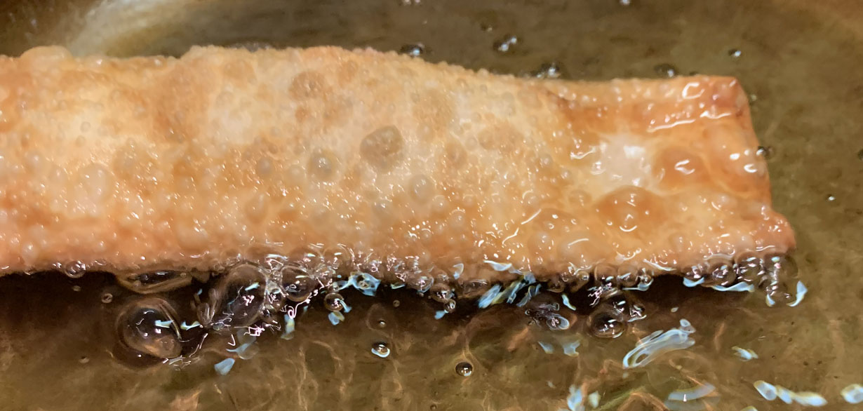 Brush the egg roll wrapper with the egg and add a heaping tablespoon of the drained filling in the middle. Wrap one side over the mix, followed by the other side to create an envelope. Seal the edges and set aside until ready to fry.