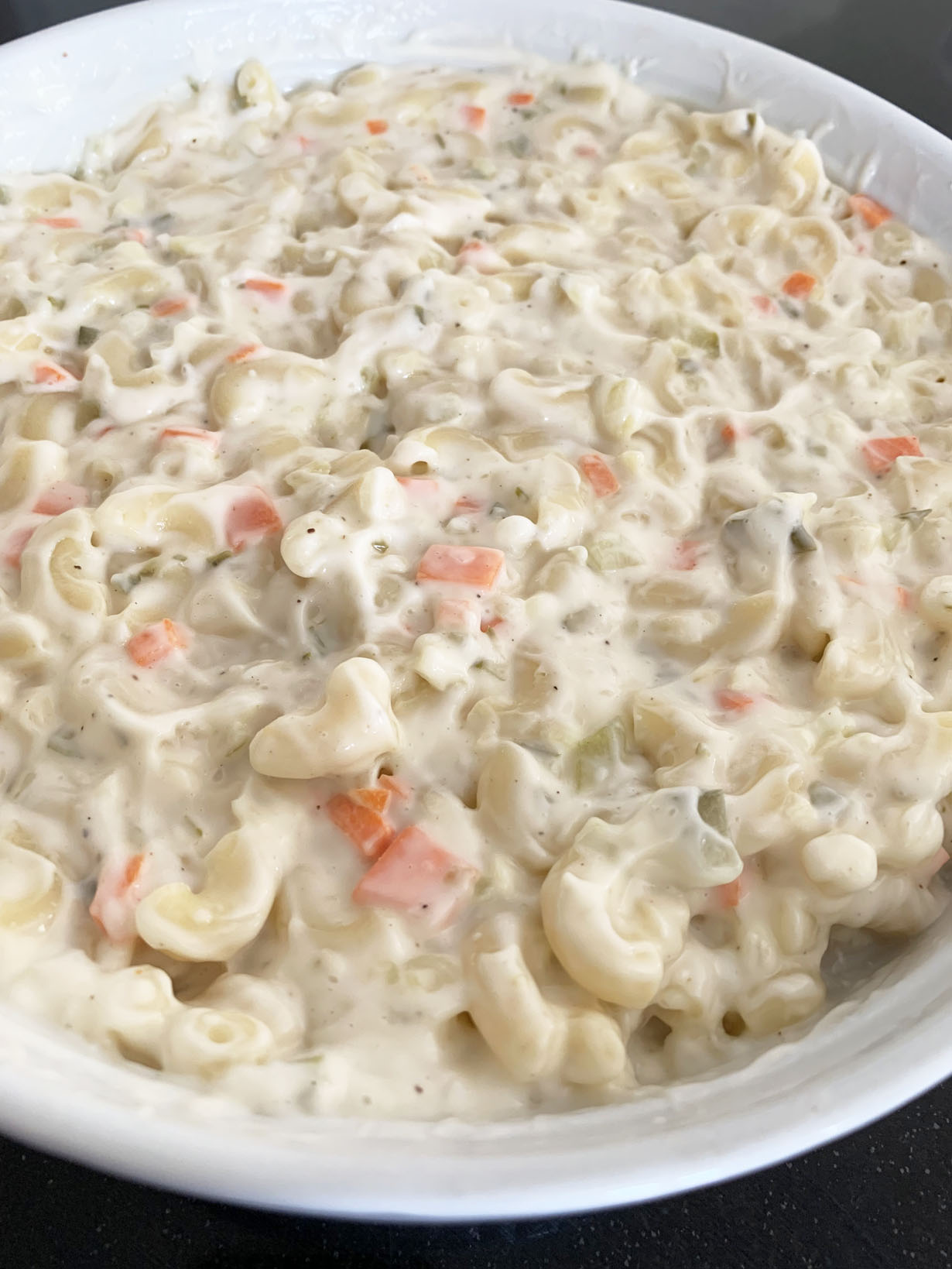 Boil the pasta according to package directions. Drain and set aside. In a bowl, mix all the other ingredients until well blended. Add the pasta and toss to cover. Refrigerate until serving.