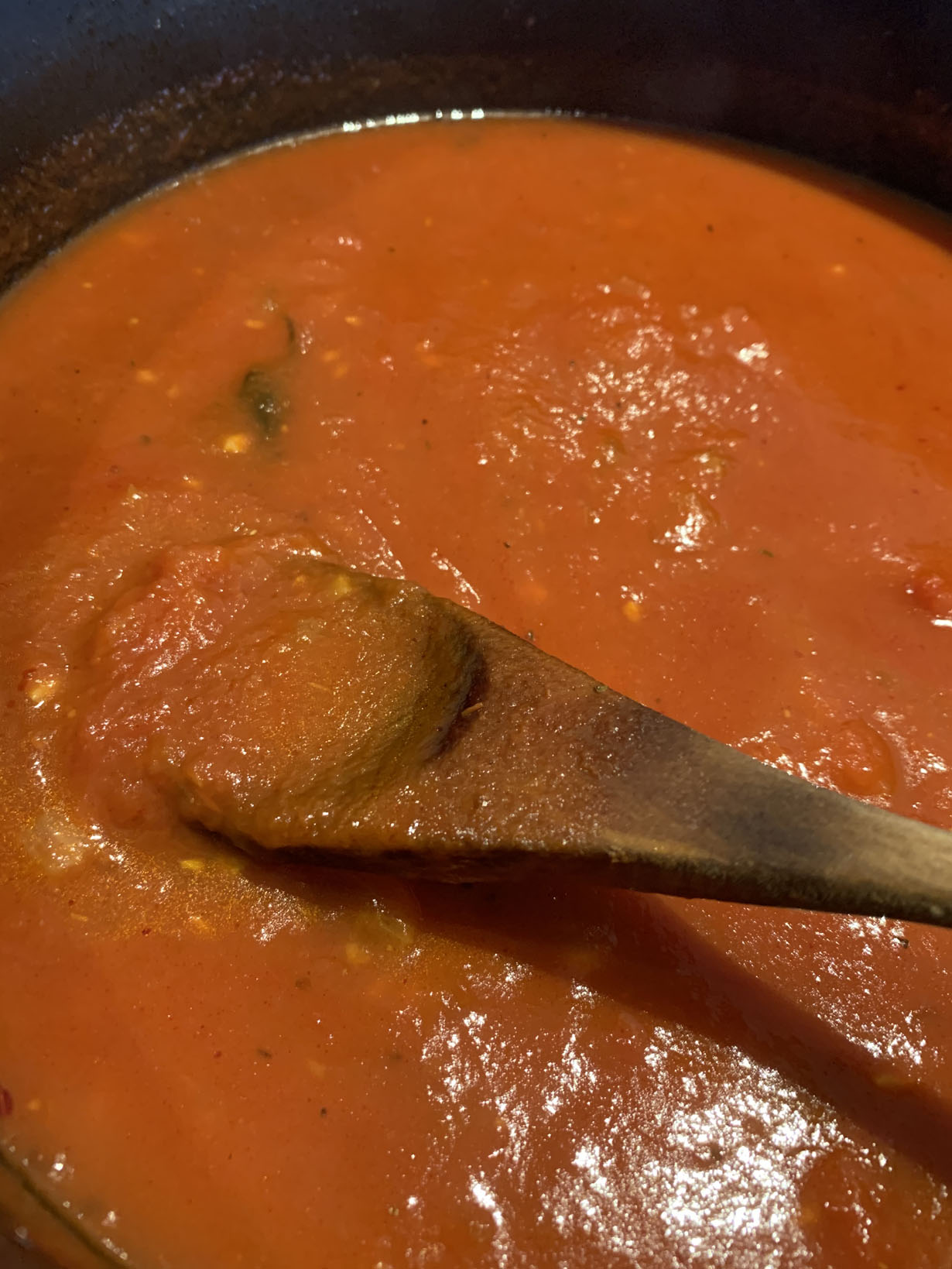 Start by preparing the tomato sauce first as it will require time to simmer. Heat the oil in a pot and add the onions, cooking until translucent (approximately 3 minutes). Add the garlic and cook for an additional minute. Crush the whole tomatoes by hand and add to the pot along with the crushed tomatoes. Use the water to rinse out any remaining tomato in the can and add to the pot. Add the stock (* beef or chicken), Worcestershire sauce, soy sauce, sugar, and spices. Mix well and drop in the cheese rind. Simmer on low until reduced to a thick consistency, approximately 3 to 4 hours.