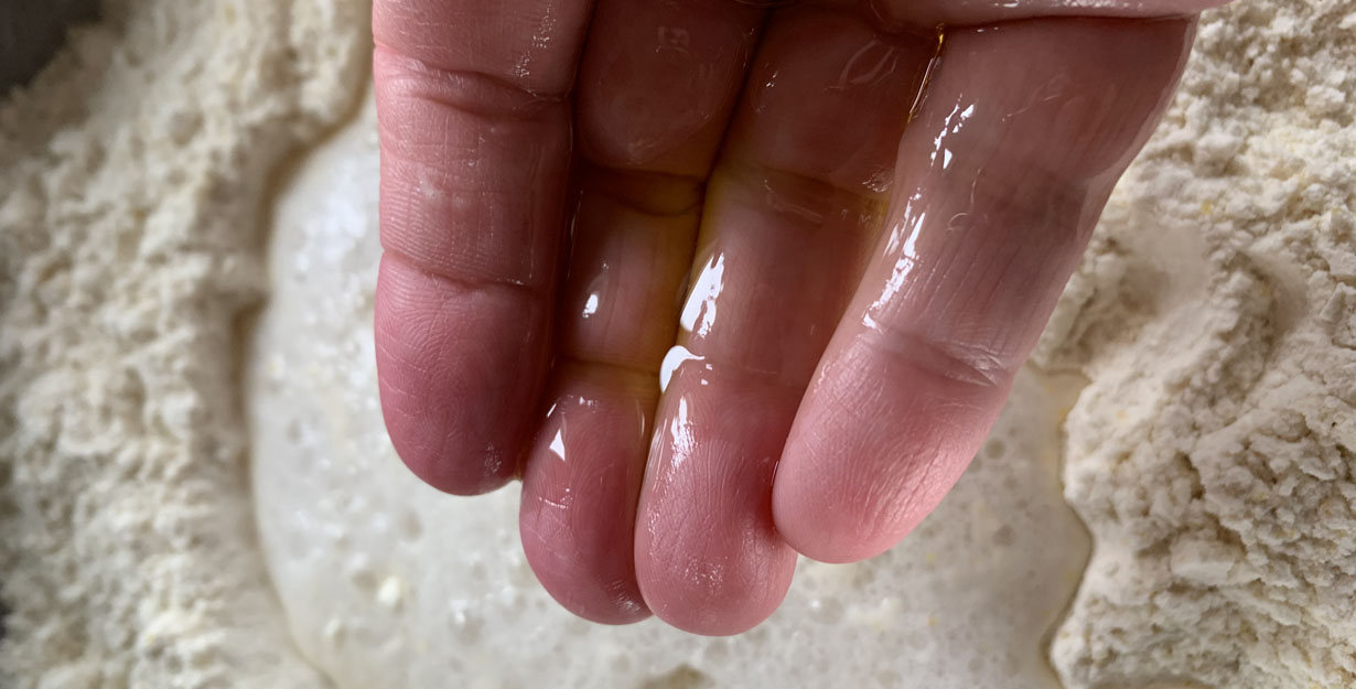 When you start combining the liquids with the dry ingredients, the mixture will by very sticky. Mix with one hand until it forms a rough mix. With your clean hand, pour the oil over your dough covered hand into the mix. Use your clean hand to remove as much dough from your hands as possible. Ensure that both hands are well oiled and begin to knead the dough in the bowl. Once combined, remove to a floured surface and continue to knead for a few minutes until the dough is smooth. If your dough still remains sticky, sprinkle more flour onto your kneading surface until the dough feels smooth. Let the dough rest for at least 1 hour.