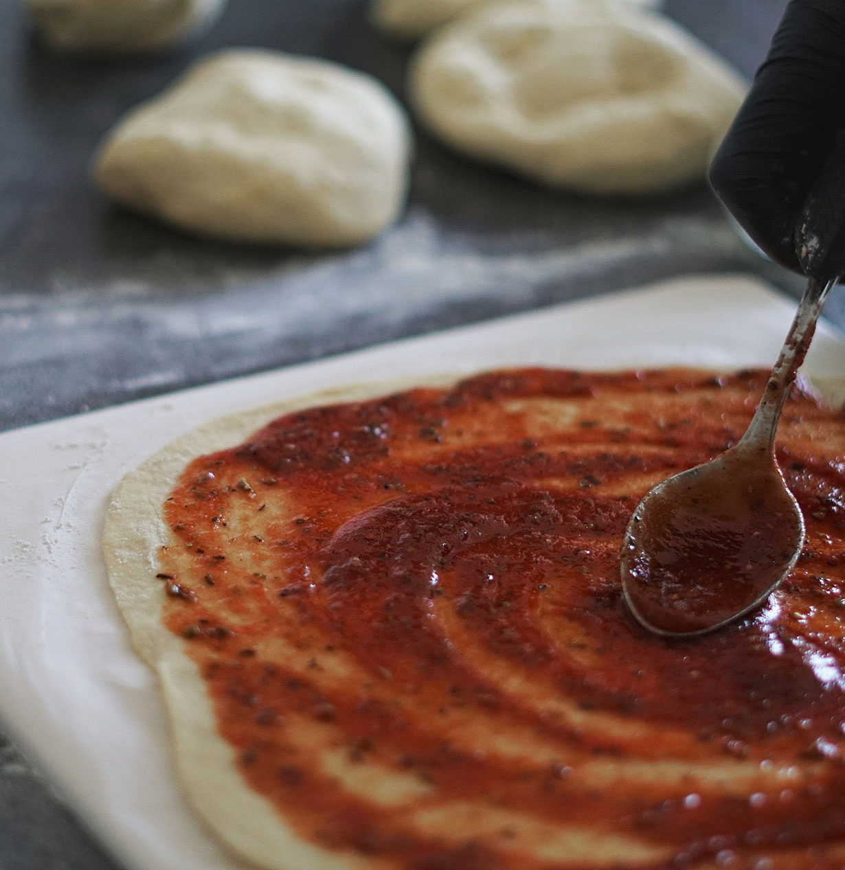 When your sauce and dough are ready, you are ready to put together your pizza. There are a couple of things that will ensure you make the best pizza. First, preheat your oven to 500°F – pizza requires a really hot oven. Next grease your pizza pan or sheet pan and dust with some cornmeal. Stretch the dough onto the greased pan (do not use a rolling pin) and allow the dough to rest in the pan once stretched for 30 minutes before you dress it. Finally add a thin layer of sauce, allowing it to rest in the dips and valleys created by stretching the dough.
