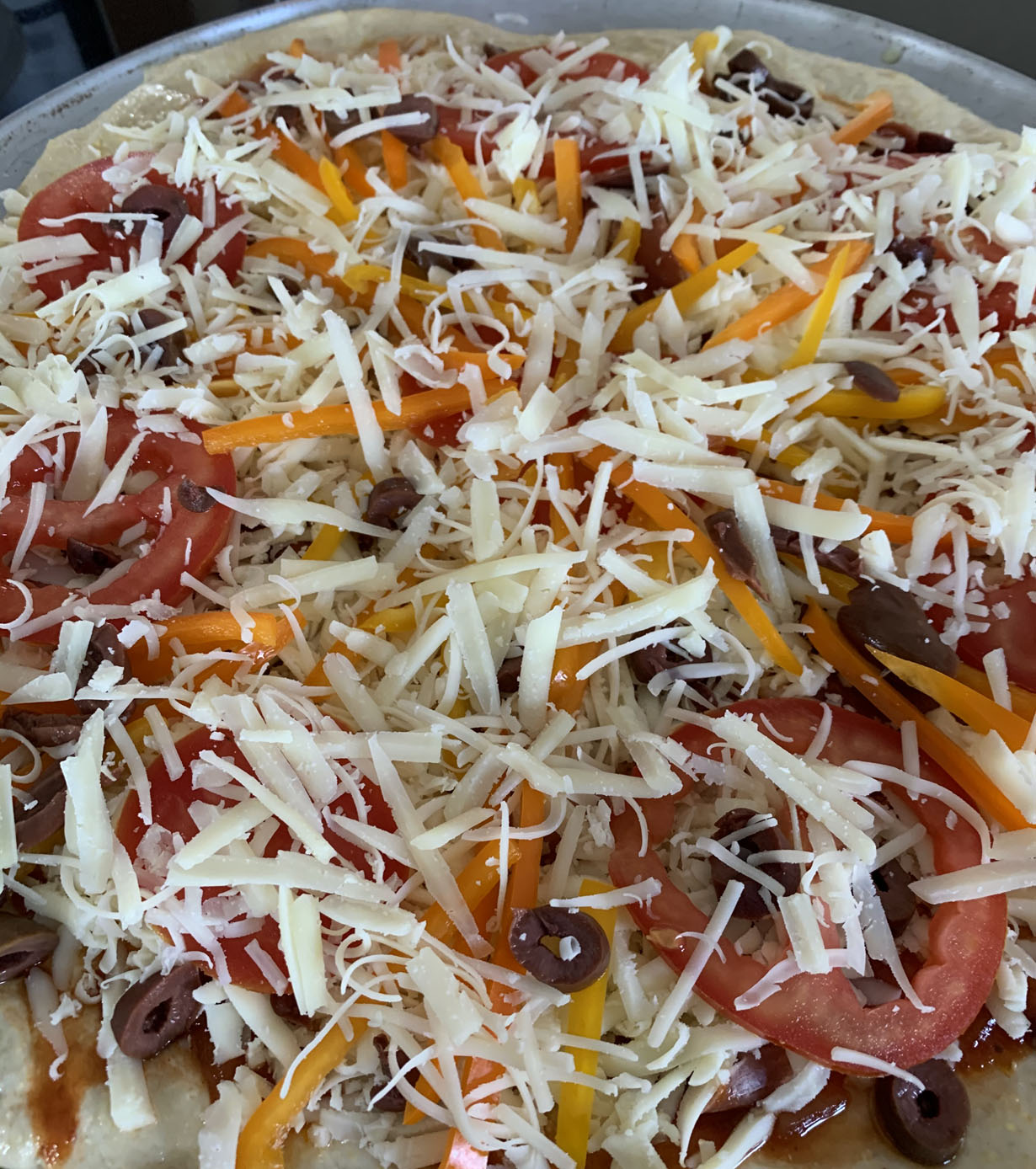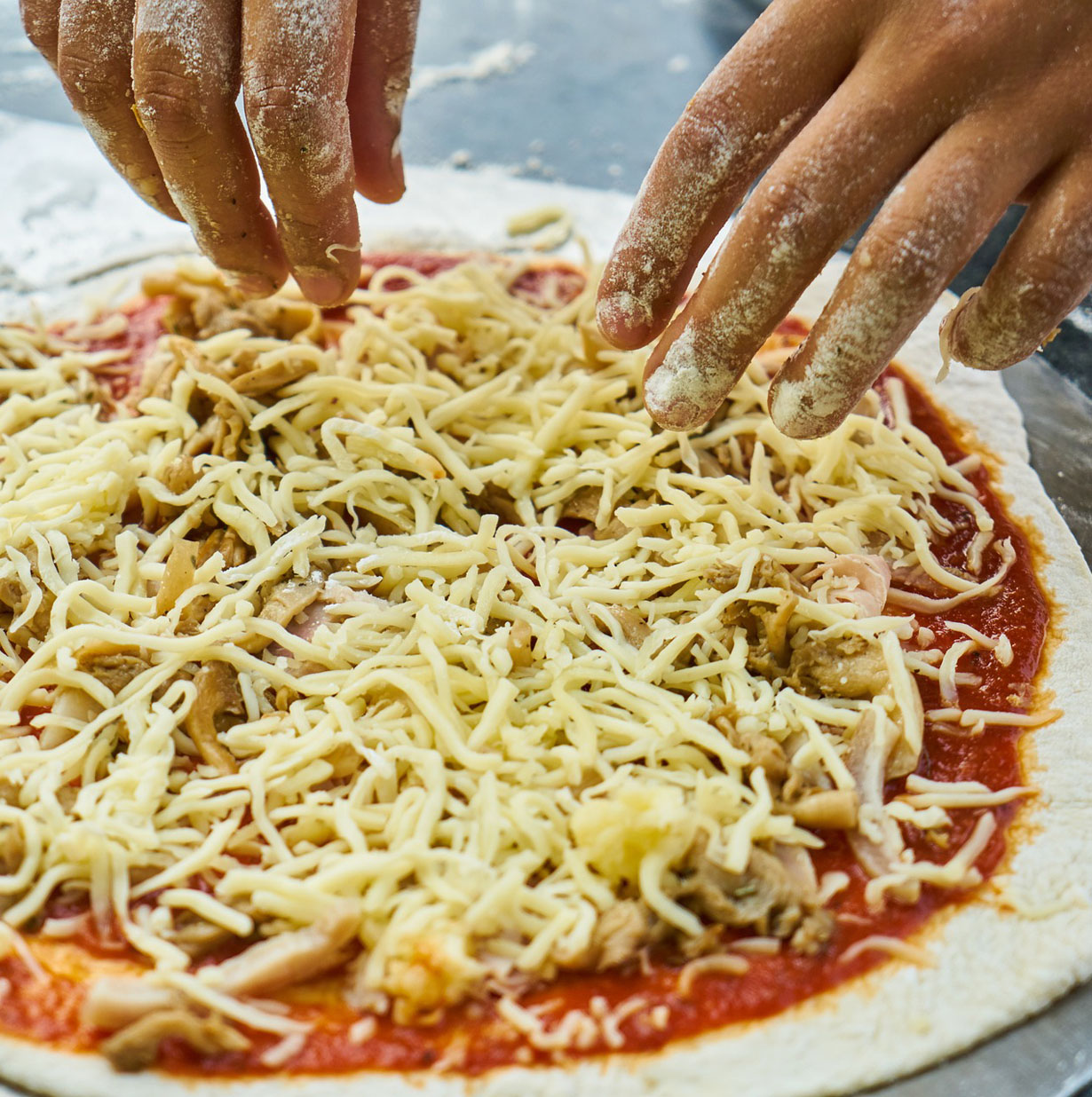 Layer your toppings evenly, whatever they may be. Toppings that will get dry and burn, hide under the cheese. Toppings that benefit from heat, keep on top of the cheese. Reserve half of the cheeses as you will add them at the end just before your pizza has baked.