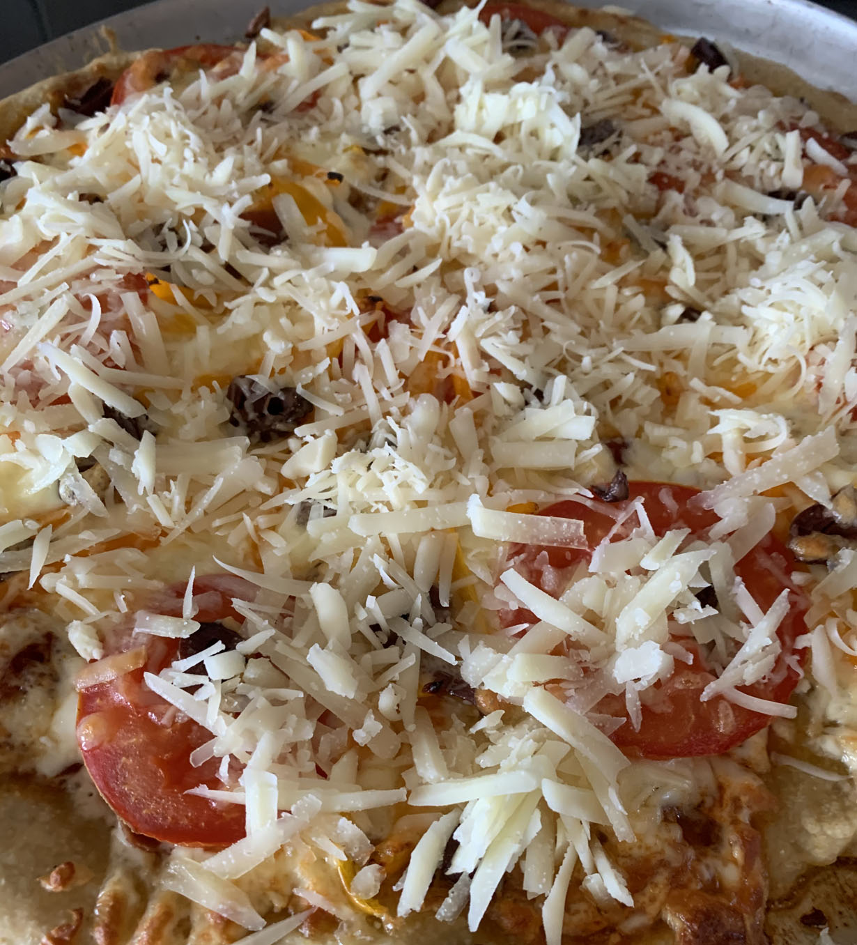 The pizza should take 10 to 15 minutes to bake (it is ready when the crust turns golden brown). At the 10 minute point, pull out the pizza and add the reserved cheeses and return to the oven for the remainder of the cooking time. This prevents the cheese from overcooking and will allow the cheeses to “thread”.
