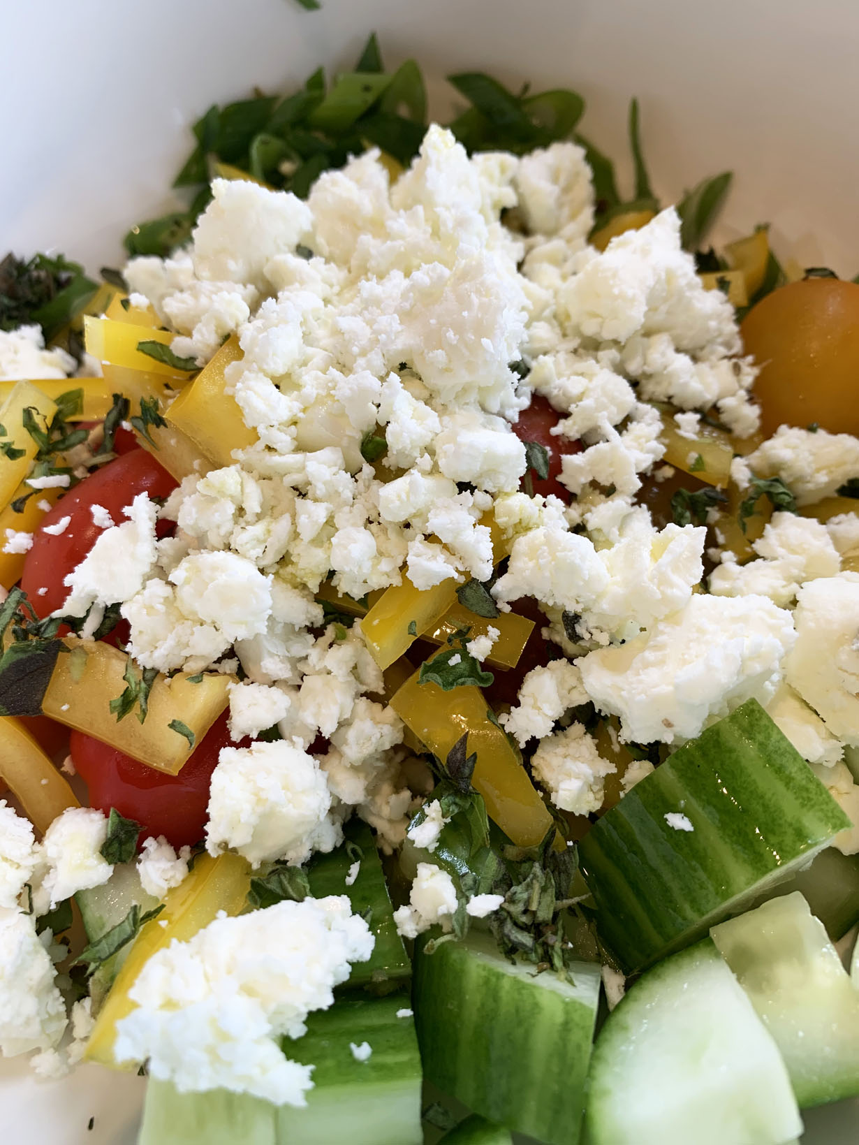 Add the scallions, bell pepper, cucumber, grape tomatoes, salt, oregano and basil into a bowl. Add half the crumbled feta. Cover and refrigerate until ready for assembly. Prepare the couscous by bringing the water to a boil with the salt and oil. Once the water boils, add the couscous and turn off the heat. Cover and let rest for 5 minutes. After 5 minutes, fluff with a fork.