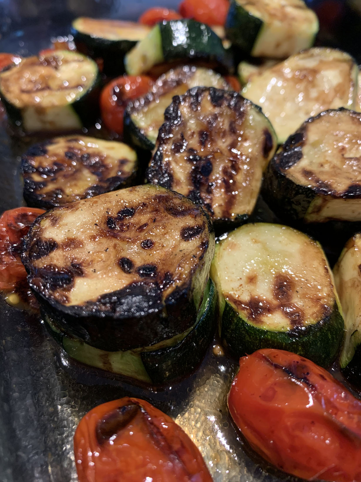 For zucchini, slice into 1” rounds and place flat onto a plate. Drizzle with vinegar and season with salt. Turn over to the other side and repeat. Skewer the zucchini through the skin alternating with tomatoes. Note that the tomatoes take a bit less time than the zucchini, however, they blister quite nicely and make an excellent combination of flavors.