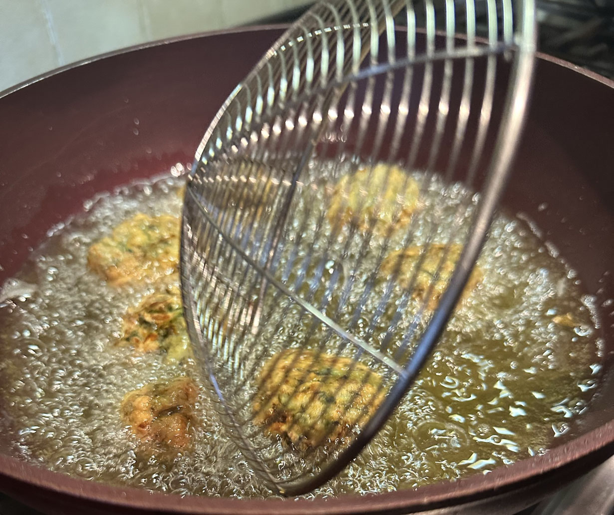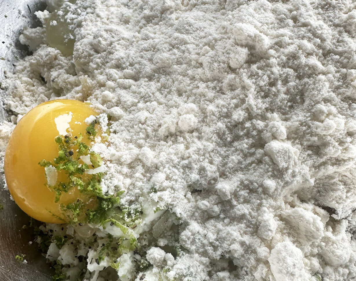 Shred the zucchini, squeeze out the moisture, and roll it in a paper towel to absorb the remaining moisture. Let the zucchini rest for a few minutes. While the zucchini is drying, soften the white onion in the olive oil until translucent (about 3 minutes.) Add to the zucchini along with the fresh herbs and salt. Toss together. Add the Parmesan cheese, feta cheese, lime zest, chopped scallions, and egg. Mix together. Add flour and bread crumbs and mix together until combined. Cover with plastic wrap and refrigerate for 1 hour.