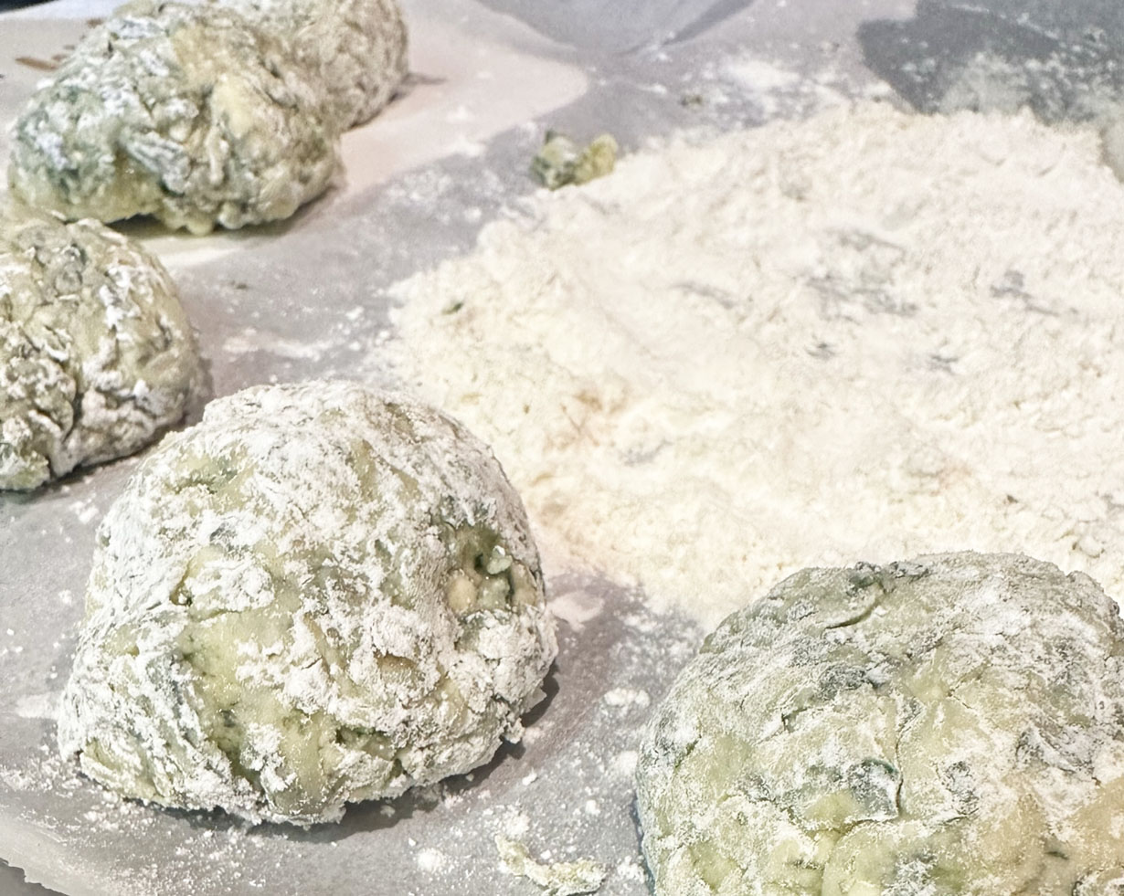 Once the mixture has chilled, lay about 1/4 cup of flour onto a piece of parchment paper. Heat the oil while preparing the meatballs. The oil needs to be hot. Using your hands, roll balls of the zucchini mixture into 1” to 1 1/2” balls and coat in the flour. (Hint: get your husband to do this for you.) Drop into the hot oil and brown on all sides.