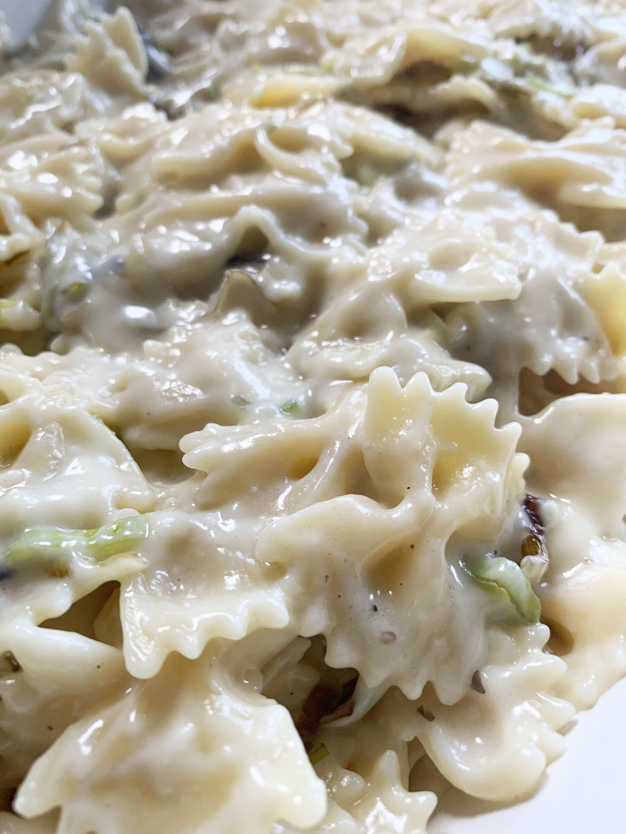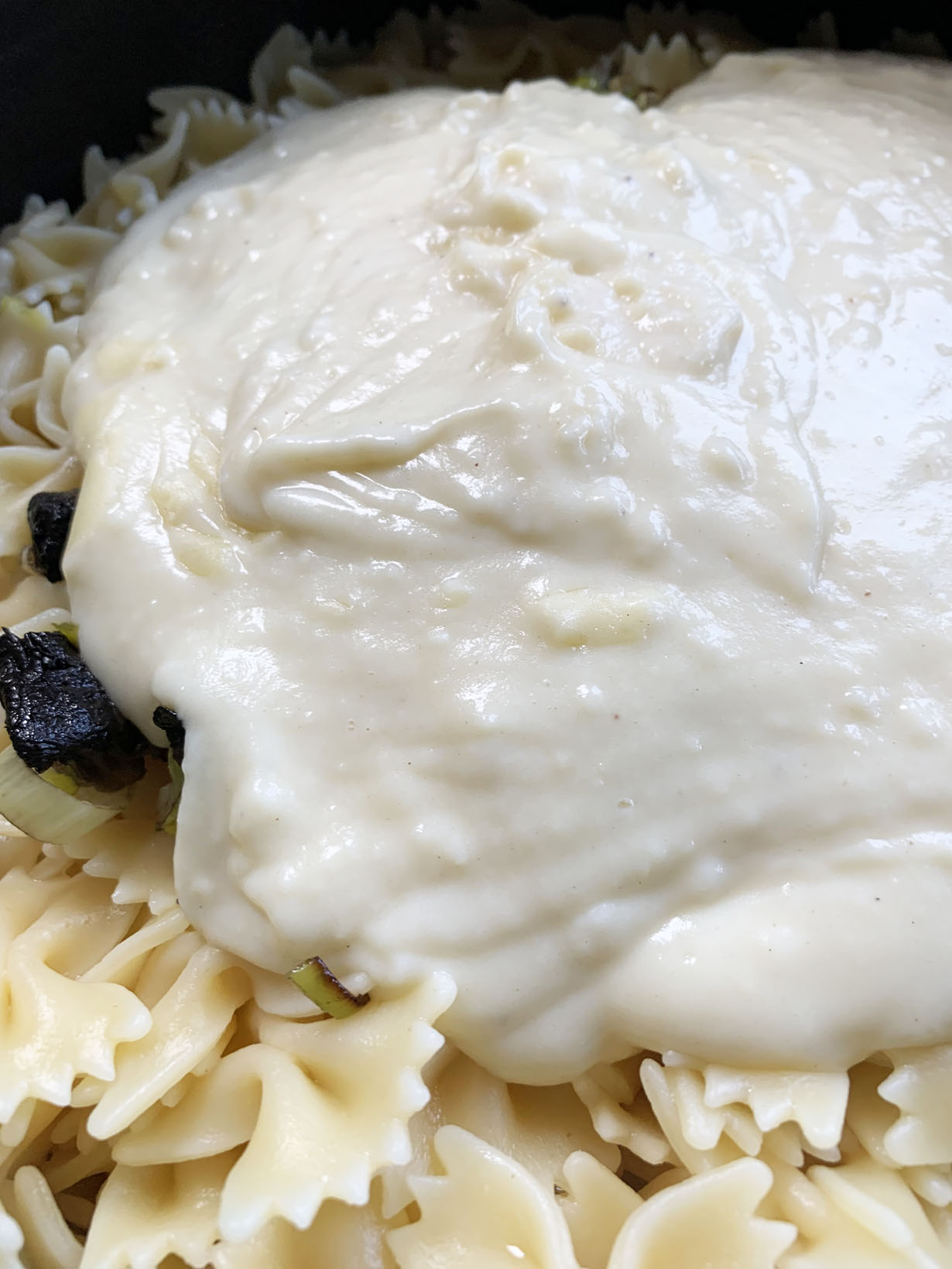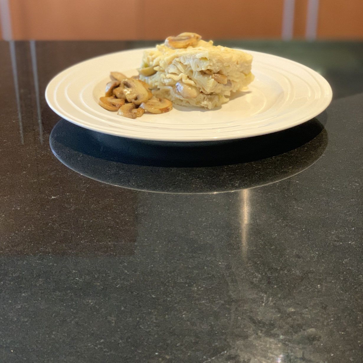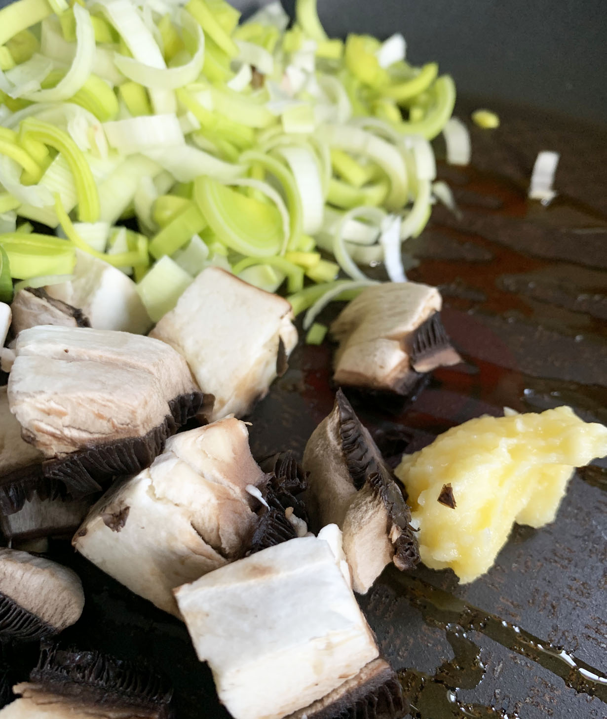 The rich and creamy bechamel adds a special touch to this baked pasta dish. The leeks adds a sweet flavor and the mushrooms add an umami touch. This filling dish makes you forget about meat as a main dish. Use any kind of pasta on hand, but shaped pasta tends to hold pockets of the bechamel best.
