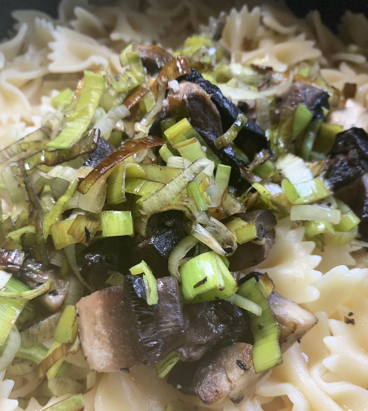 Melt the butter and the olive oil in a pan. Add the sliced leeks and mushrooms and season with salt and pepper to taste. Cook until caramelized. In the meantime, boil the pasta in salted water according to the package directions. Drain and toss with the mushrooms and leeks.