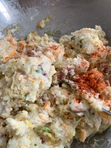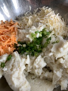 Blend together the mashed potatoes, flour, cheeses, bacon, chopped onion, spices and eggs.