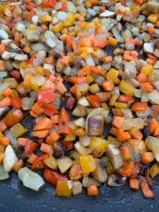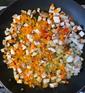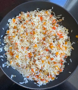 Heat the oil and, once heated, add the vegetables and spices cooking until caramelized (approximately 10 minutes). Prepare the rice according to package directions. Strain the rice from the boiling water and it add to the cooked vegetables. Stir until well combined.