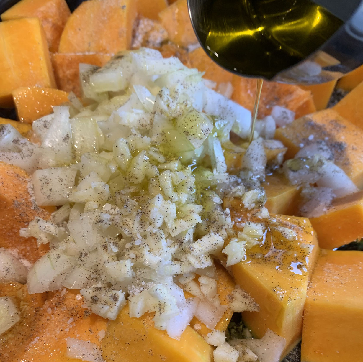 Preheat the oven to 400°F. Peel and cut the squash and sweet potatoes into relatively even cubes. Add the chopped onion and garlic along with the spices. Add the oil and honey and toss to coat the vegetables. Place in a baking dish and cook for 40 minutes to 1 hour or until a fork can go through the potatoes easily. Serve immediately.