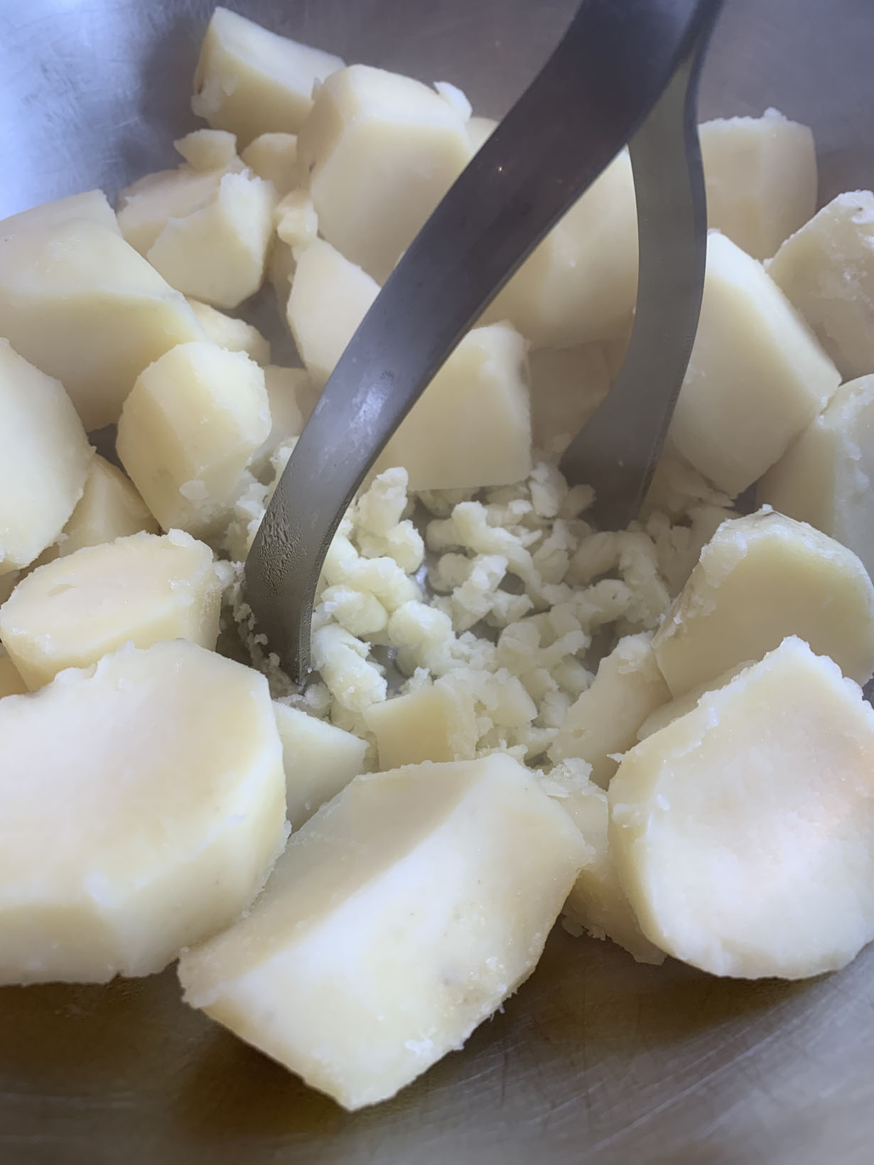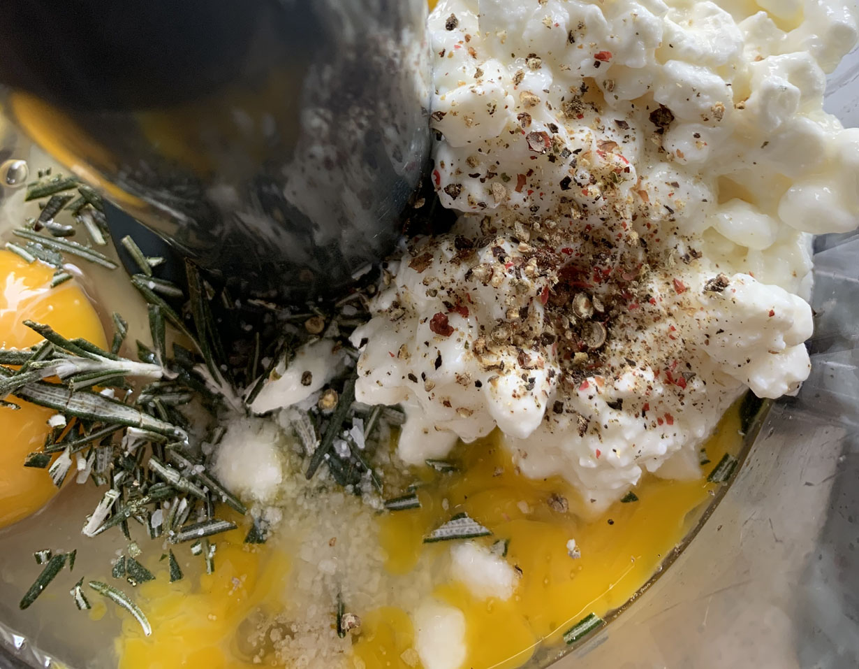 Peel and quarter the potatoes and cook in salted boiling water for 15 minutes until tender. While the potatoes are cooking, strain the cottage cheese to remove some of the liquid (*ricotta cheese can also be used). Mix together the eggs, cottage cheese, salt, pepper and rosemary in a food processor. Pulse until well combined.