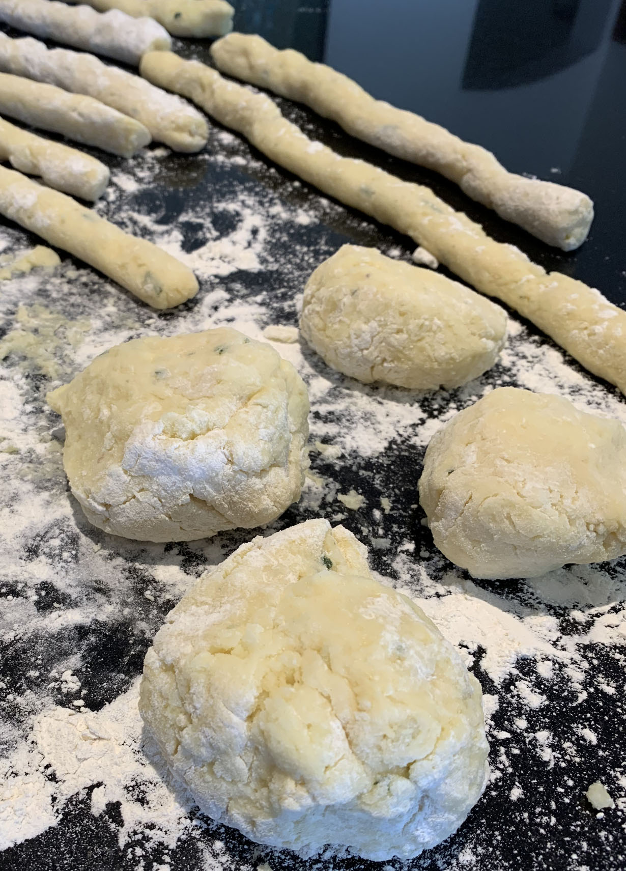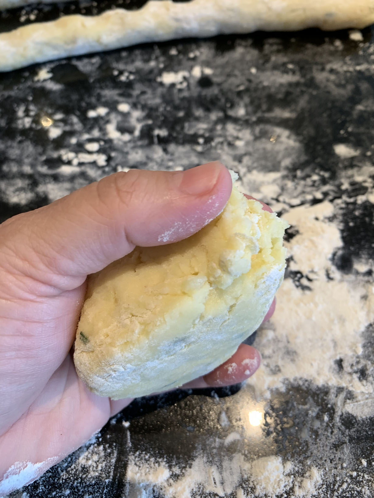 Remove the eggs from the liquid and mash them. Add 1/2 cup of the flour and the egg mix to the mashed potatoes and incorporate the dough. Turn the dough over onto a floured surface dusted with the remaining 1/2 cup of flour. Lightly knead the dough and add a little more flour if the dough sticks to your fingers. Let the dough rest for 10 minutes.