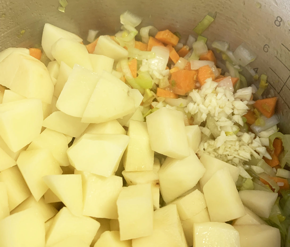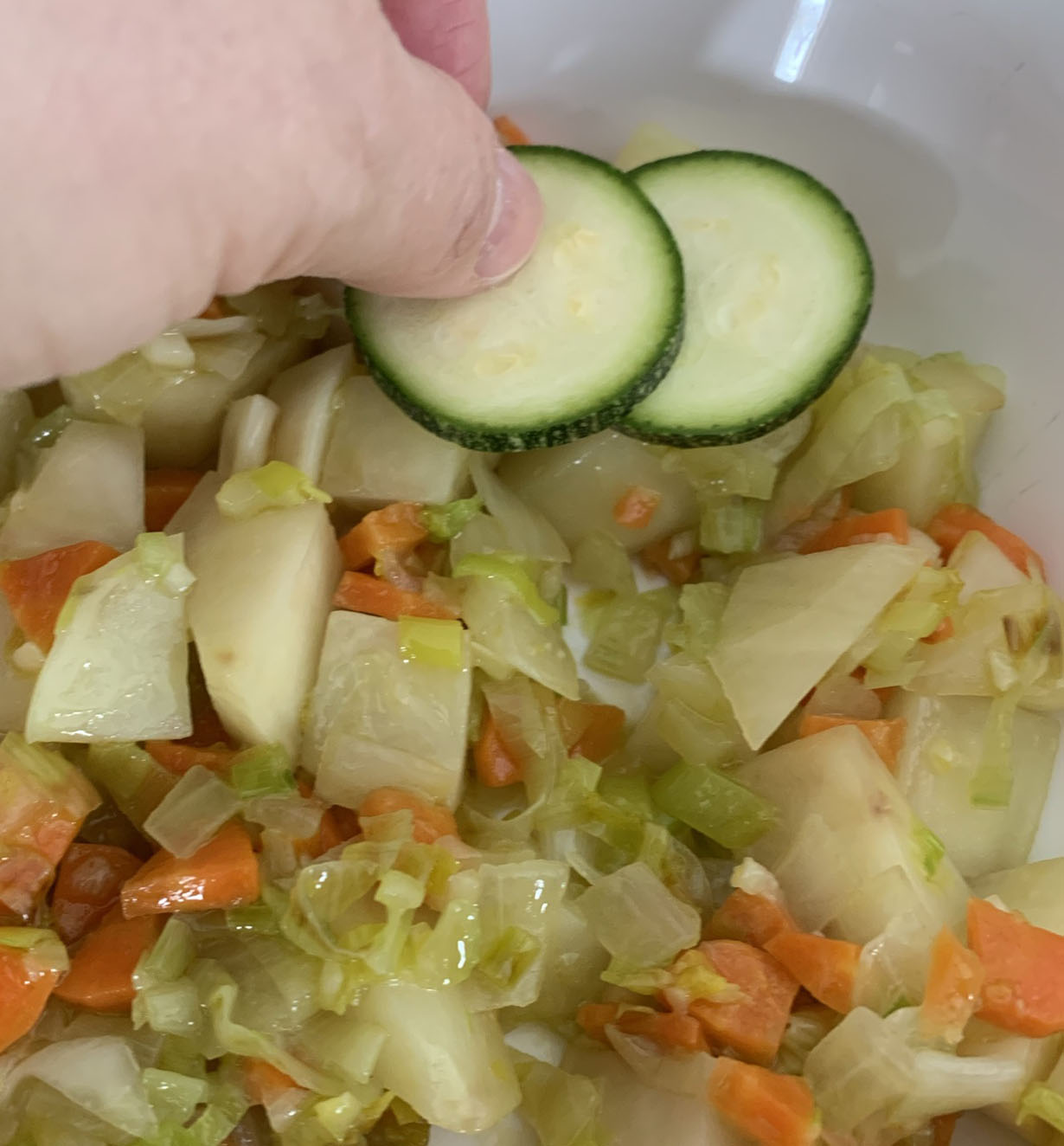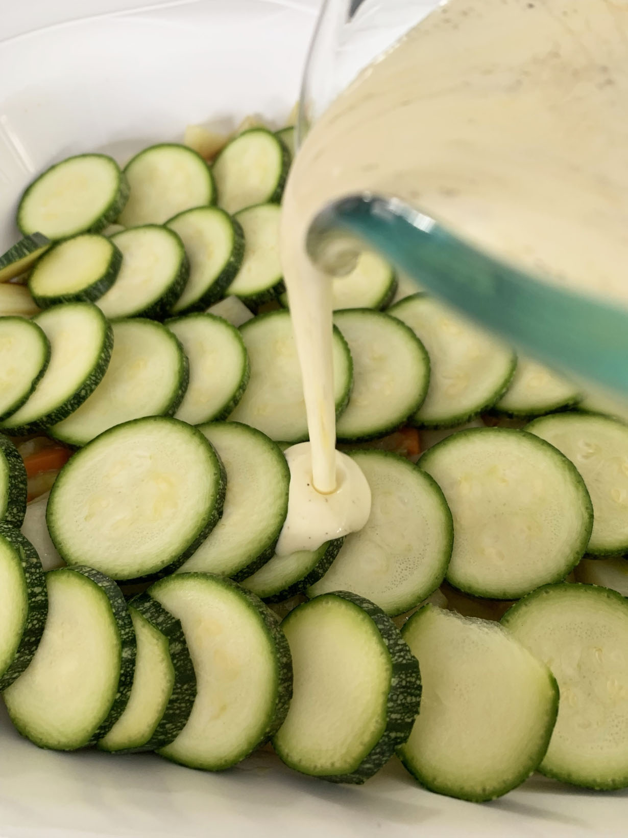 Add the oil to the bottom of the pan along with the onion, leek, carrot, and celery. Cook until translucent, approximately 5 minutes. Add the cubed potato and garlic and cook for an additional 2 minutes, tossing continuously so that the potatoes don’t stick. Transfer to a 9” x 13” oven-safe baking pan. Arrange the sliced zucchini along the top of the potato mixture and pour the cream mixture over the entire surface. Sprinkle with the crumbled feta followed by the gruyère cheese.