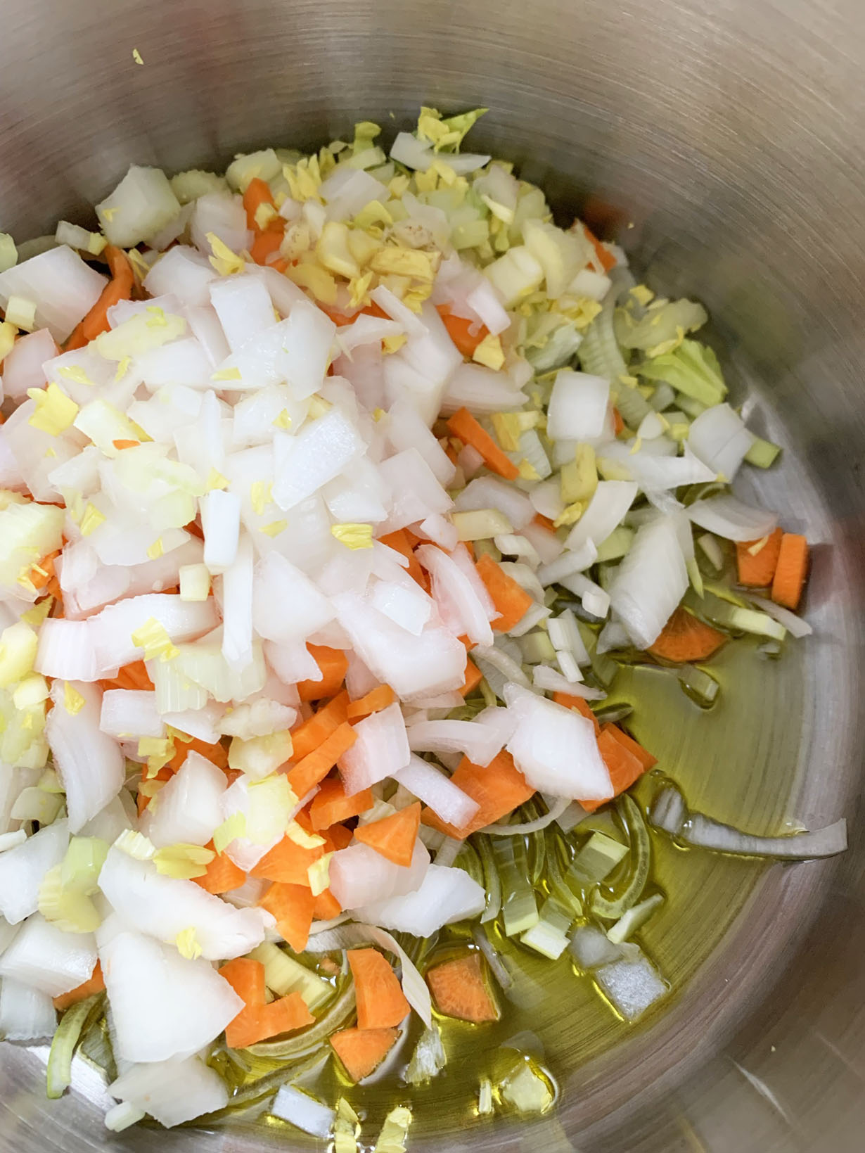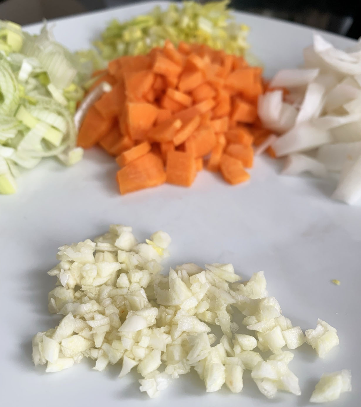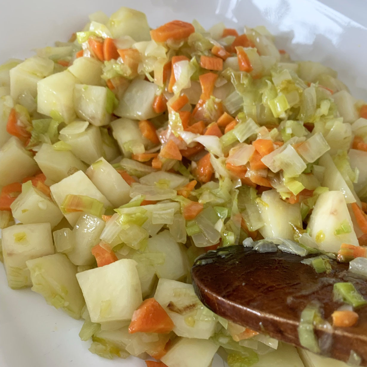 Add the oil to the bottom of the pan along with the onion, leek, carrot, and celery. Cook until translucent, approximately 5 minutes. Add the cubed potato and garlic and cook for an additional 2 minutes, tossing continuously so that the potatoes don’t stick. Transfer to a 9” x 13” oven-safe baking pan. Arrange the sliced zucchini along the top of the potato mixture and pour the cream mixture over the entire surface. Sprinkle with the crumbled feta followed by the gruyère cheese.